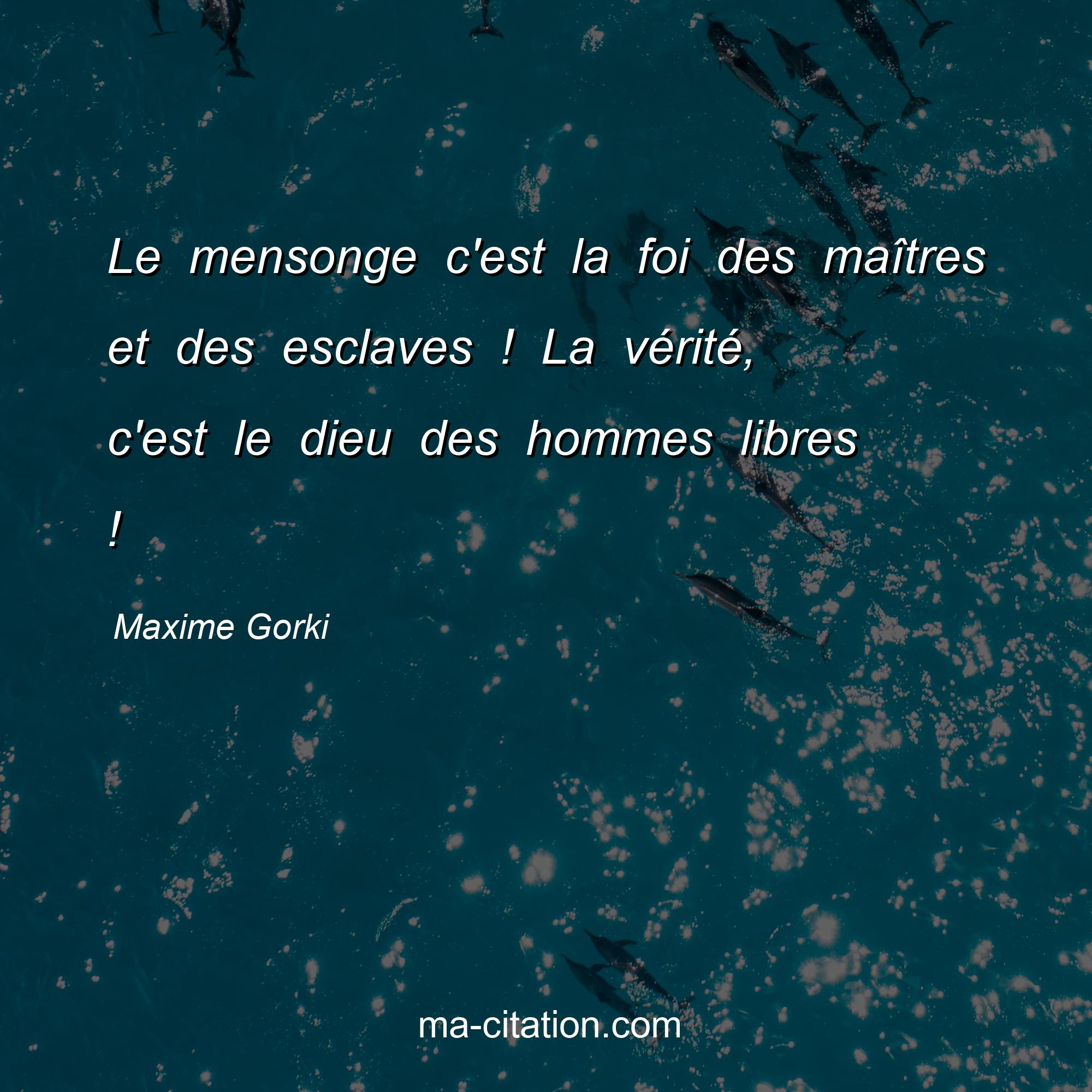 Citation sur la vie de Maxime Gorki :Le mensonge c'est la foi des maîtres et des esclaves ! La vérité, c'est le dieu des hommes libres !