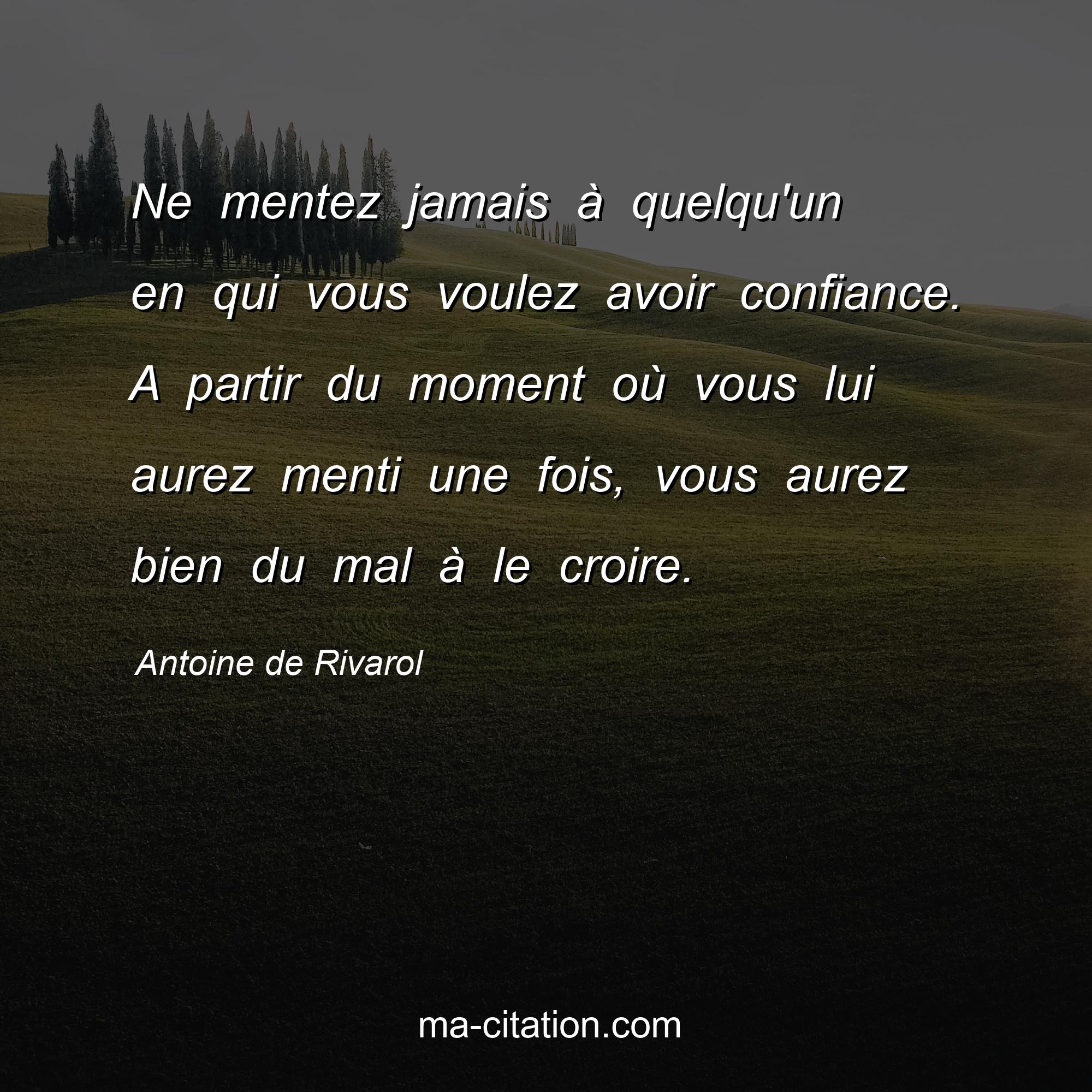 Citation sur la vie d'Antoine de Rivarol :Ne mentez jamais à quelqu'un en qui vous voulez avoir confiance. A partir du moment où vous lui aurez menti une fois, vous aurez bien du mal à le croire.