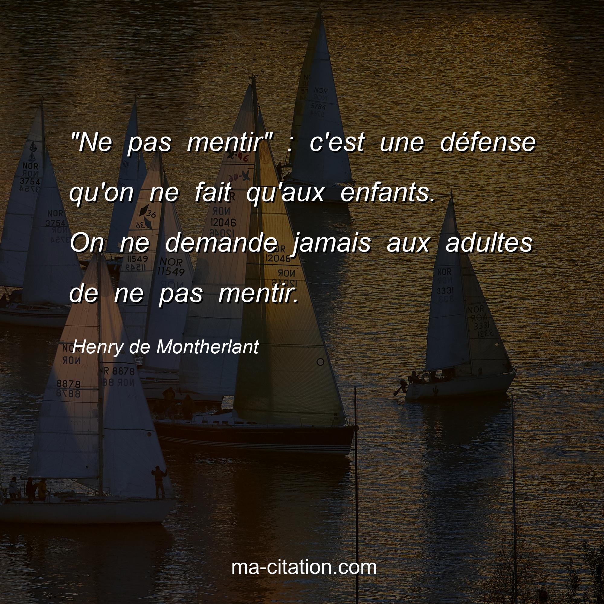 Citation sur la vie de Henry de Montherlant :"Ne pas mentir" : c'est une défense qu'on ne fait qu'aux enfants. On ne demande jamais aux adultes de ne pas mentir.