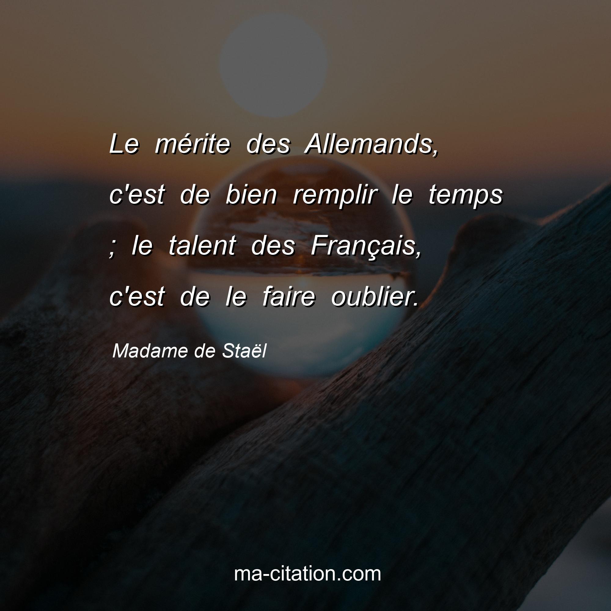 Citation sur la vie de Madame de Staël :Le mérite des Allemands, c'est de bien remplir le temps ; le talent des Français, c'est de le faire oublier.