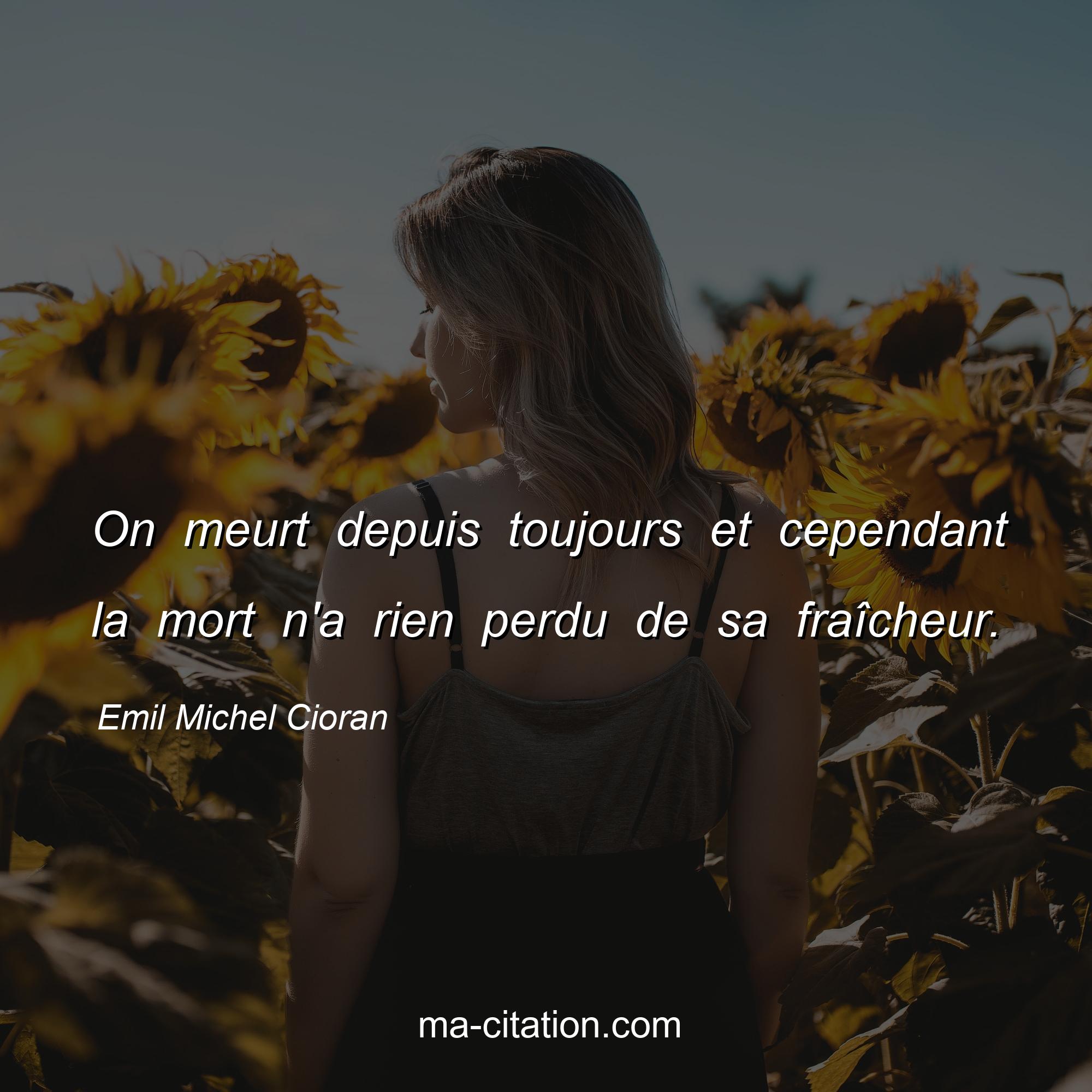 Citation sur la vie d'Emil Michel Cioran :On meurt depuis toujours et cependant la mort n'a rien perdu de sa fraîcheur.