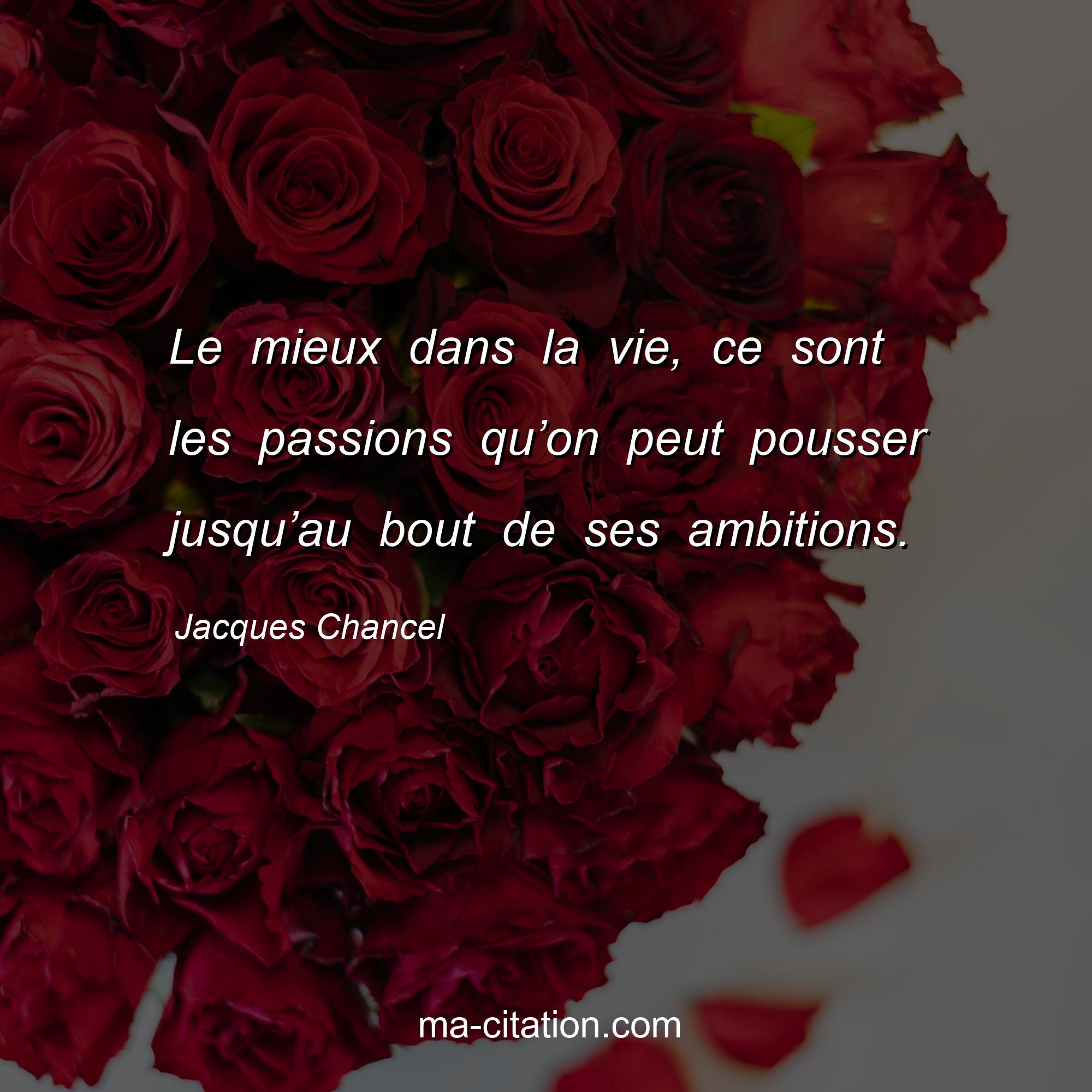 Citation sur la vie de Jacques Chancel :Le mieux dans la vie, ce sont les passions qu’on peut pousser jusqu’au bout de ses ambitions.