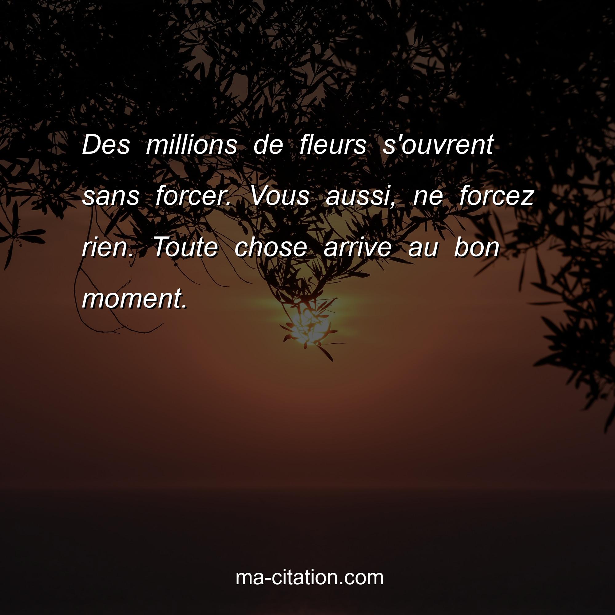 Des millions de fleurs s'ouvrent sans forcer. Vous aussi, ne forcez rien. Toute chose arrive au bon moment.