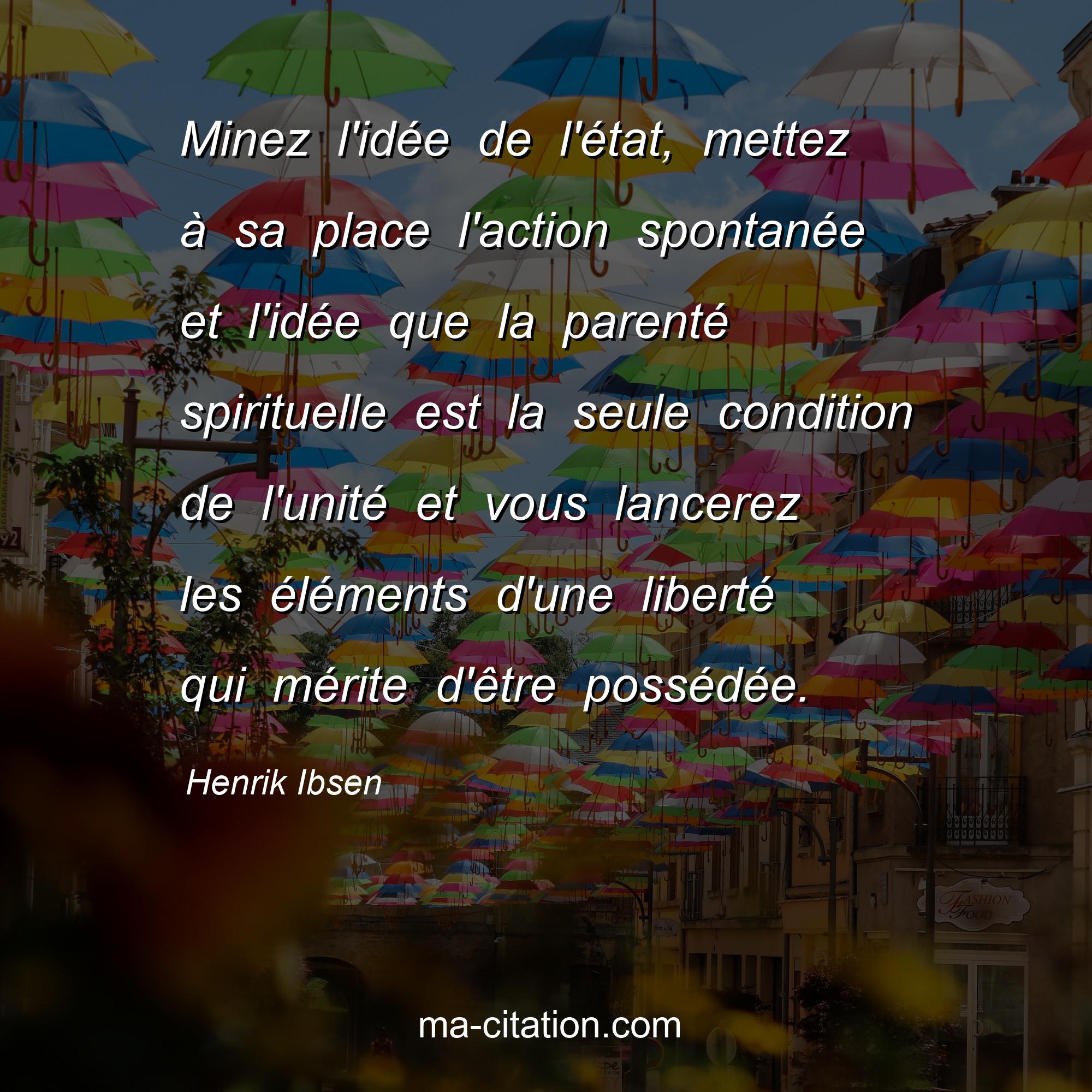 Citation sur la vie de Henrik Ibsen :Minez l'idée de l'état, mettez à sa place l'action spontanée et l'idée que la parenté spirituelle est la seule condition de l'unité et vous lancerez les éléments d'une liberté qui mérite d'être possédée.