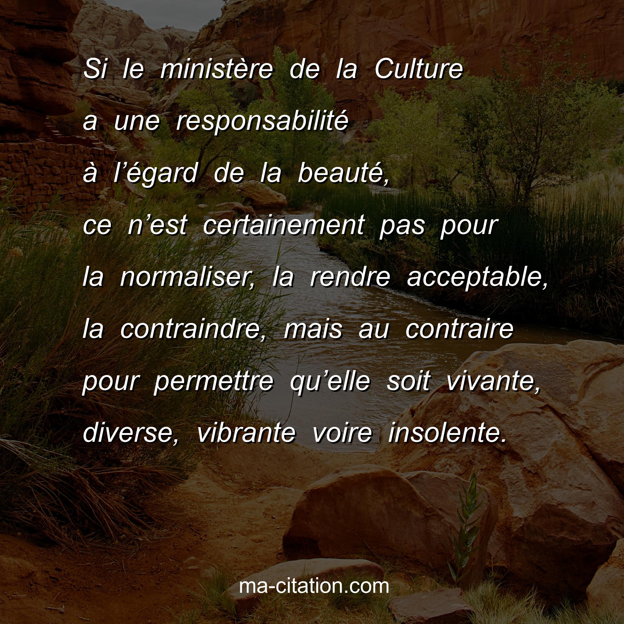 Si le ministère de la Culture a une responsabilité à l’égard de la beauté, ce n’est certainement pas pour la normaliser, la rendre acceptable, la contraindre, mais au contraire pour permettre qu’elle soit vivante, diverse, vibrante voire insolente.