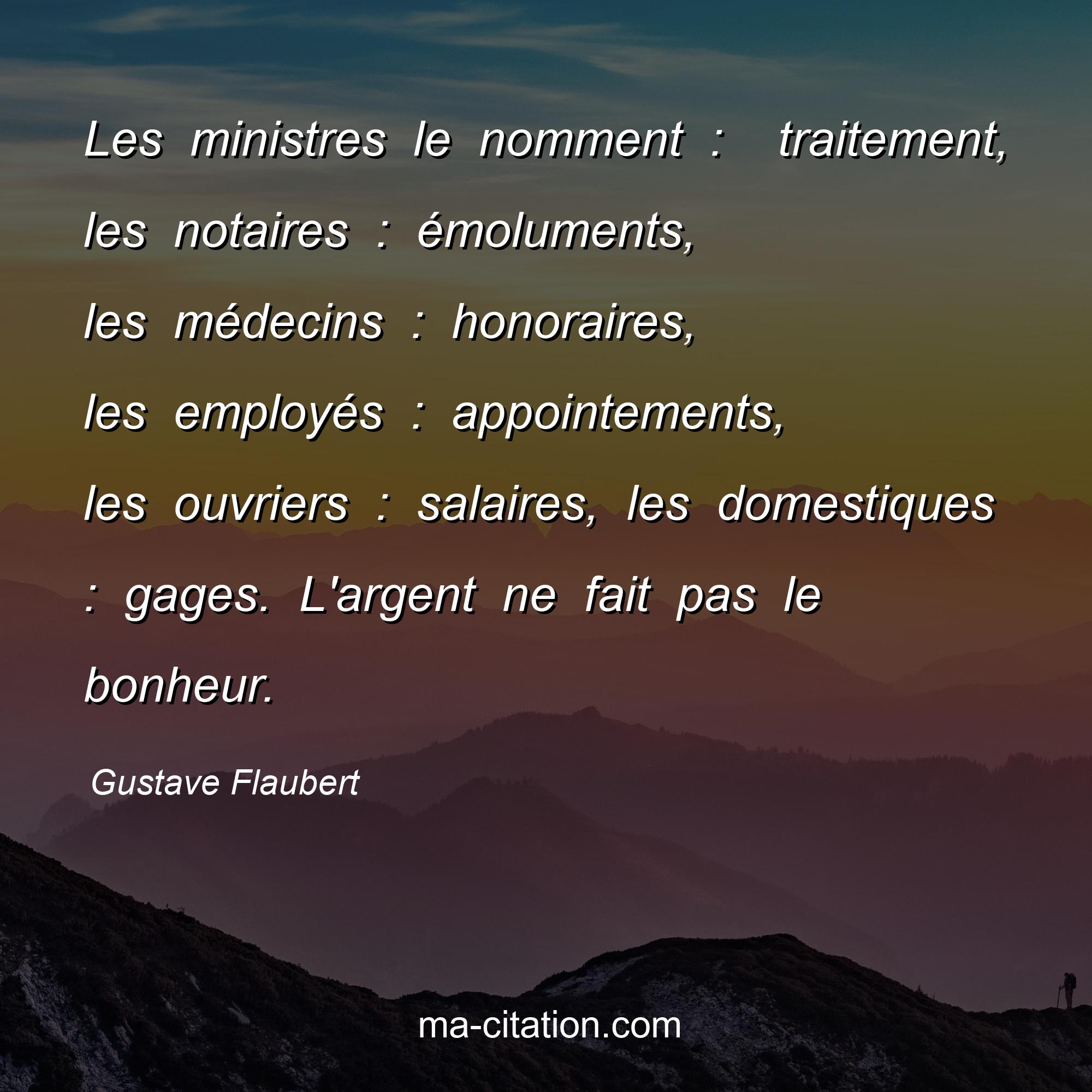 Citation sur la vie de Gustave Flaubert :Les ministres le nomment : traitement, les notaires : émoluments, les médecins : honoraires, les employés : appointements, les ouvriers : salaires, les domestiques : gages. L'argent ne fait pas le bonheur.