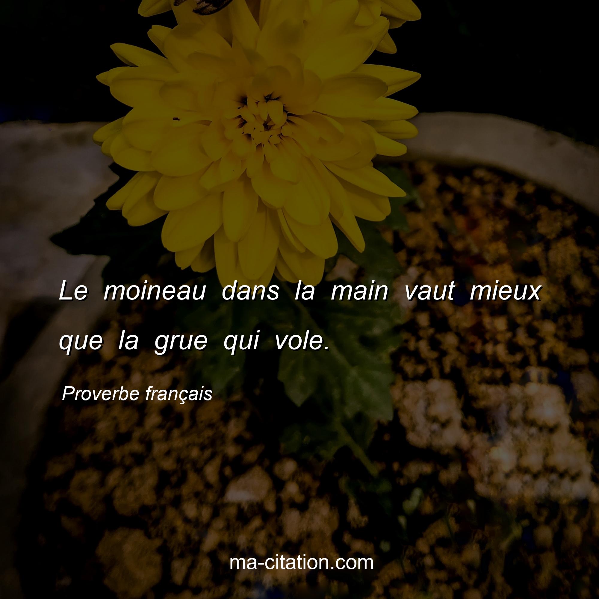 Proverbe français sur la vie :Le moineau dans la main vaut mieux que la grue qui vole.
