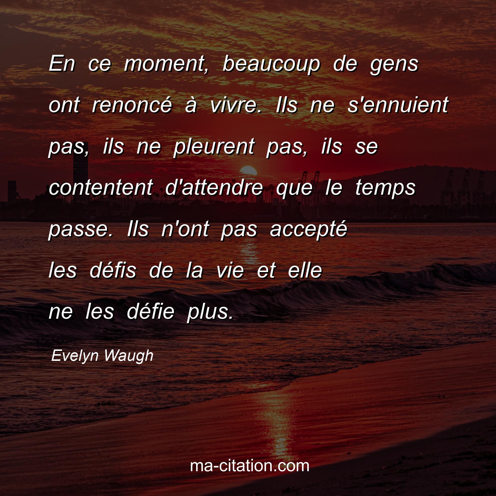 Citation sur la vie d'Evelyn Waugh :En ce moment, beaucoup de gens ont renoncé à vivre. Ils ne s'ennuient pas, ils ne pleurent pas, ils se contentent d'attendre que le temps passe. Ils n'ont pas accepté les défis de la vie et elle ne les défie plus.