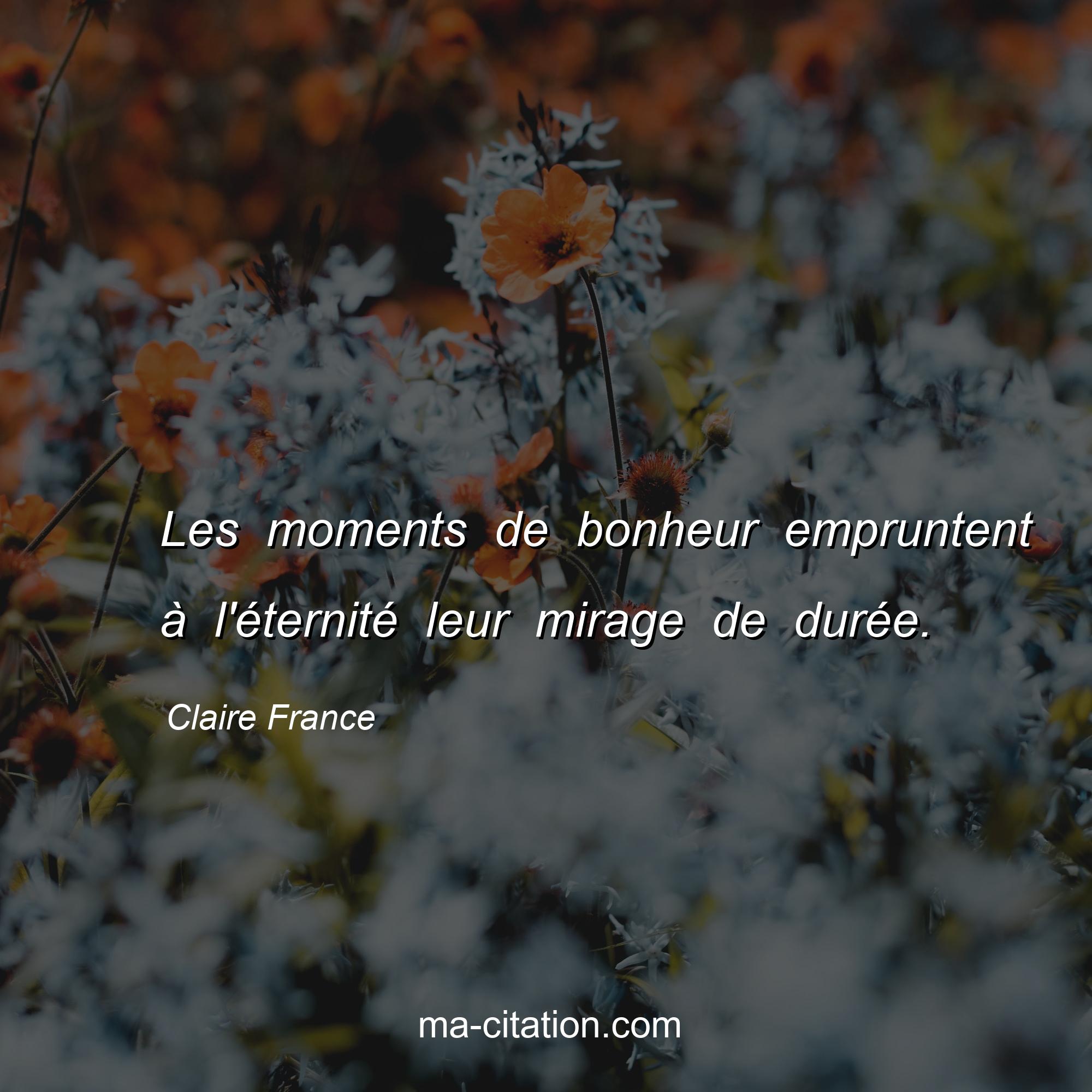 Claire France est l'auteur de la citation sur la vie "Les moments de bonheur empruntent à l'éternité leur mirage de durée.".