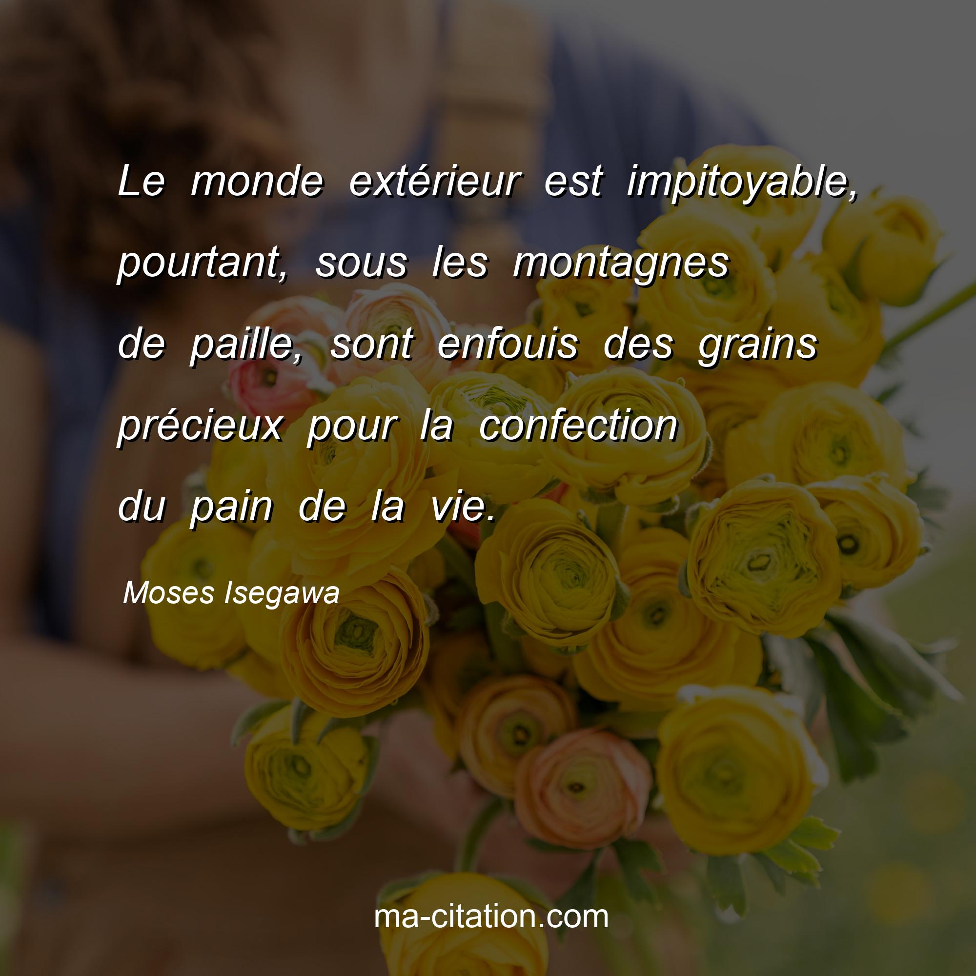 Citation sur la vie de Moses Isegawa :Le monde extérieur est impitoyable, pourtant, sous les montagnes de paille, sont enfouis des grains précieux pour la confection du pain de la vie.