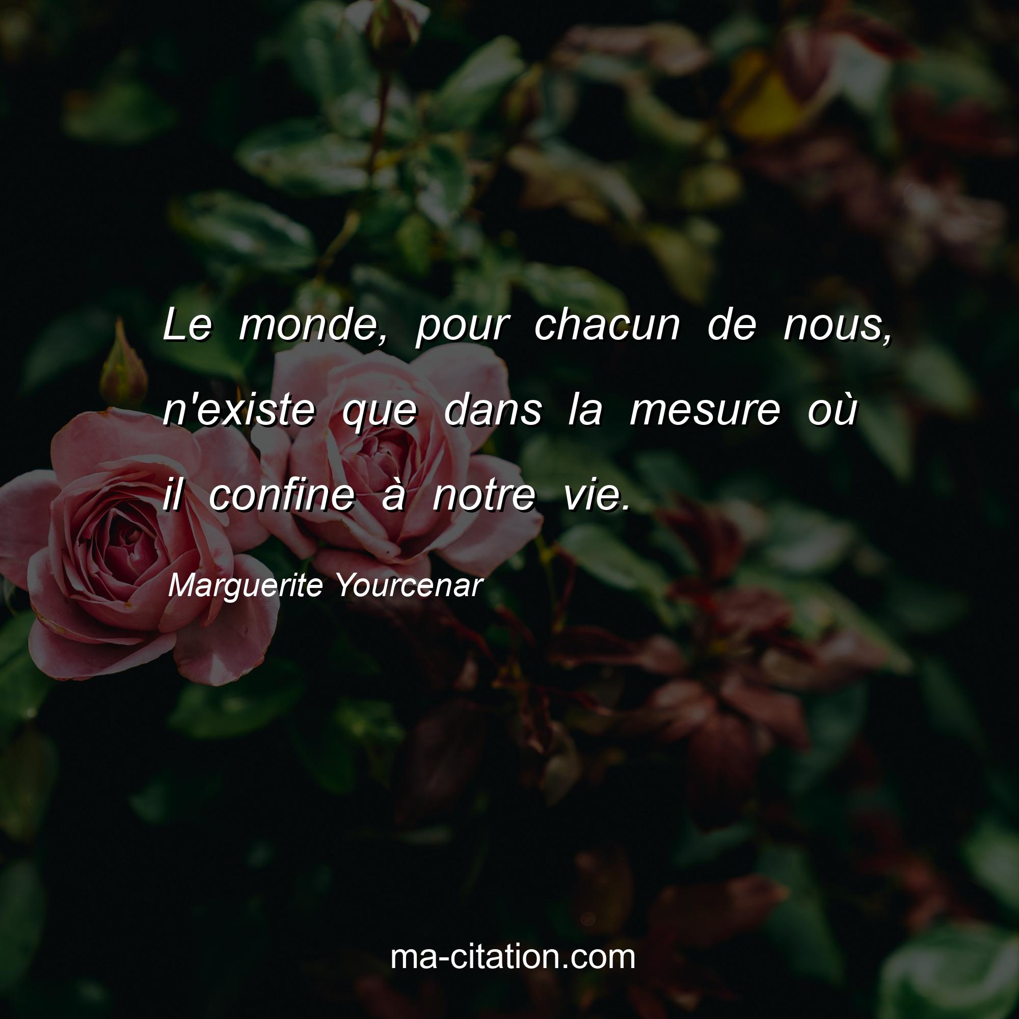 Citation sur la vie de Marguerite Yourcenar :Le monde, pour chacun de nous, n'existe que dans la mesure où il confine à notre vie.