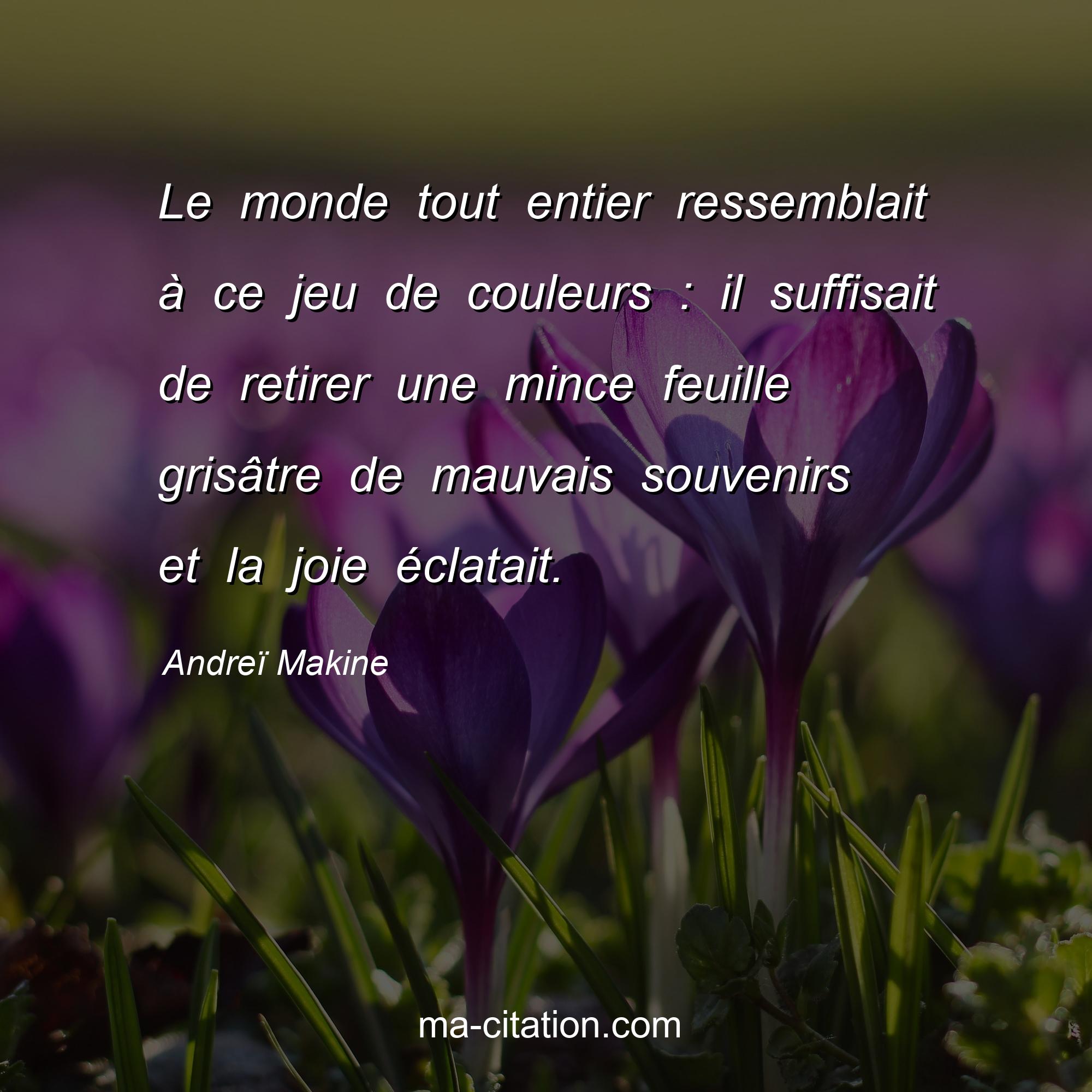 Citation sur la vie d'Andreï Makine :Le monde tout entier ressemblait à ce jeu de couleurs : il suffisait de retirer une mince feuille grisâtre de mauvais souvenirs et la joie éclatait.
