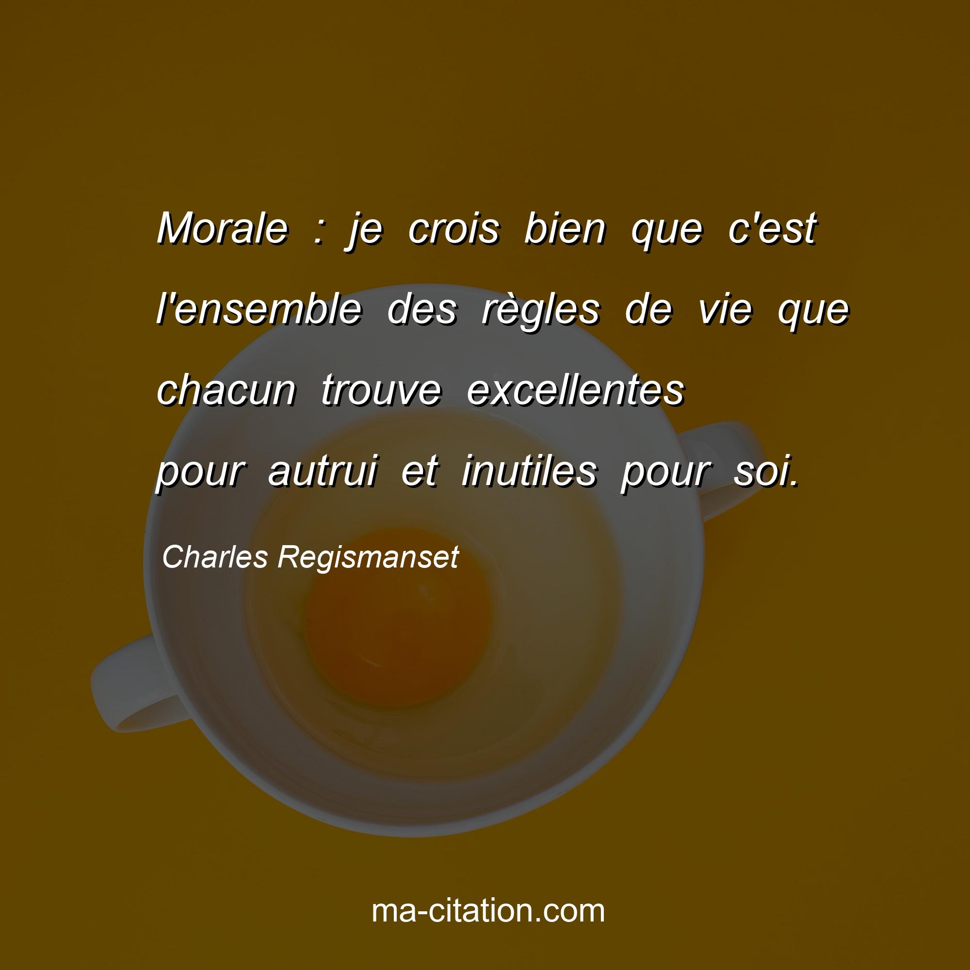 Citation sur la vie de Charles Regismanset :Morale : je crois bien que c'est l'ensemble des règles de vie que chacun trouve excellentes pour autrui et inutiles pour soi.