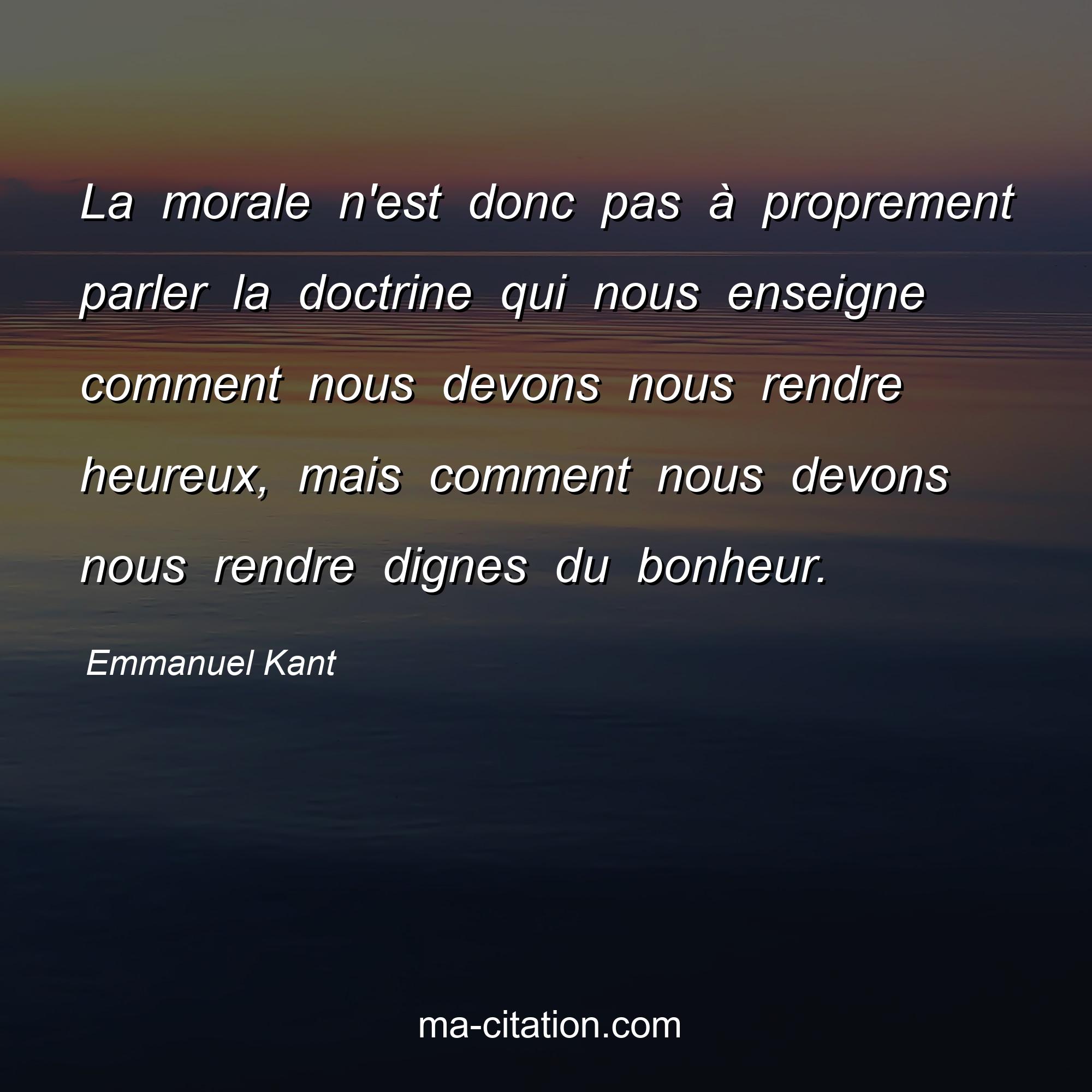 Citation sur la vie d'Emmanuel Kant :La morale n'est donc pas à proprement parler la doctrine qui nous enseigne comment nous devons nous rendre heureux, mais comment nous devons nous rendre dignes du bonheur.