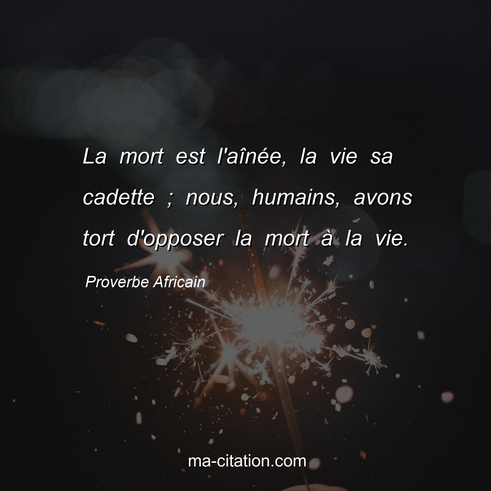 Proverbe Africain sur la vie :La mort est l'aînée, la vie sa cadette ; nous, humains, avons tort d'opposer la mort à la vie.