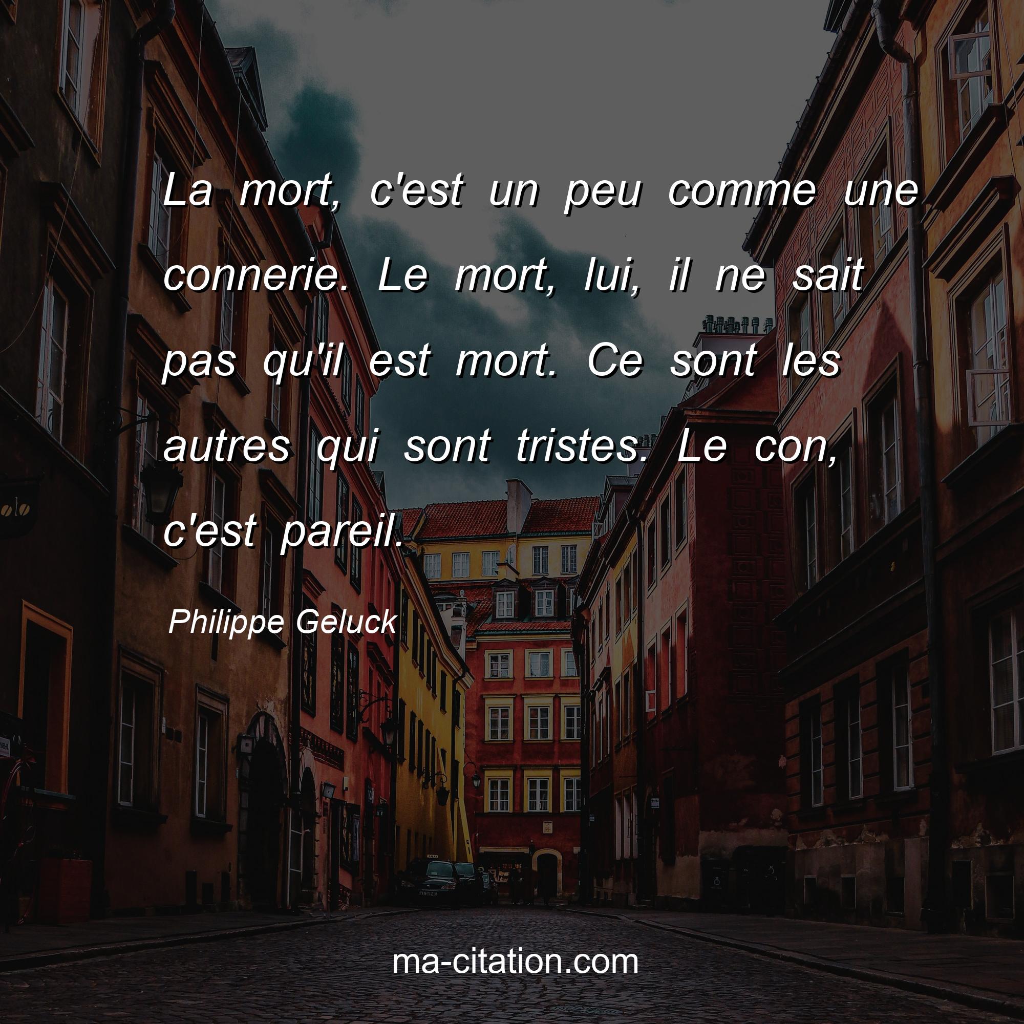 Citation sur la vie de Philippe Geluck :La mort, c'est un peu comme une connerie. Le mort, lui, il ne sait pas qu'il est mort. Ce sont les autres qui sont tristes. Le con, c'est pareil.