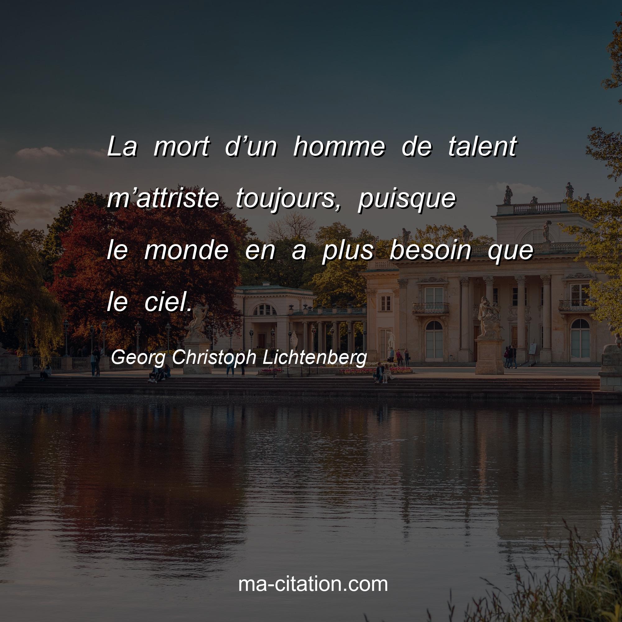 Citation sur la vie de Georg Christoph Lichtenberg :La mort d’un homme de talent m’attriste toujours, puisque le monde en a plus besoin que le ciel.
