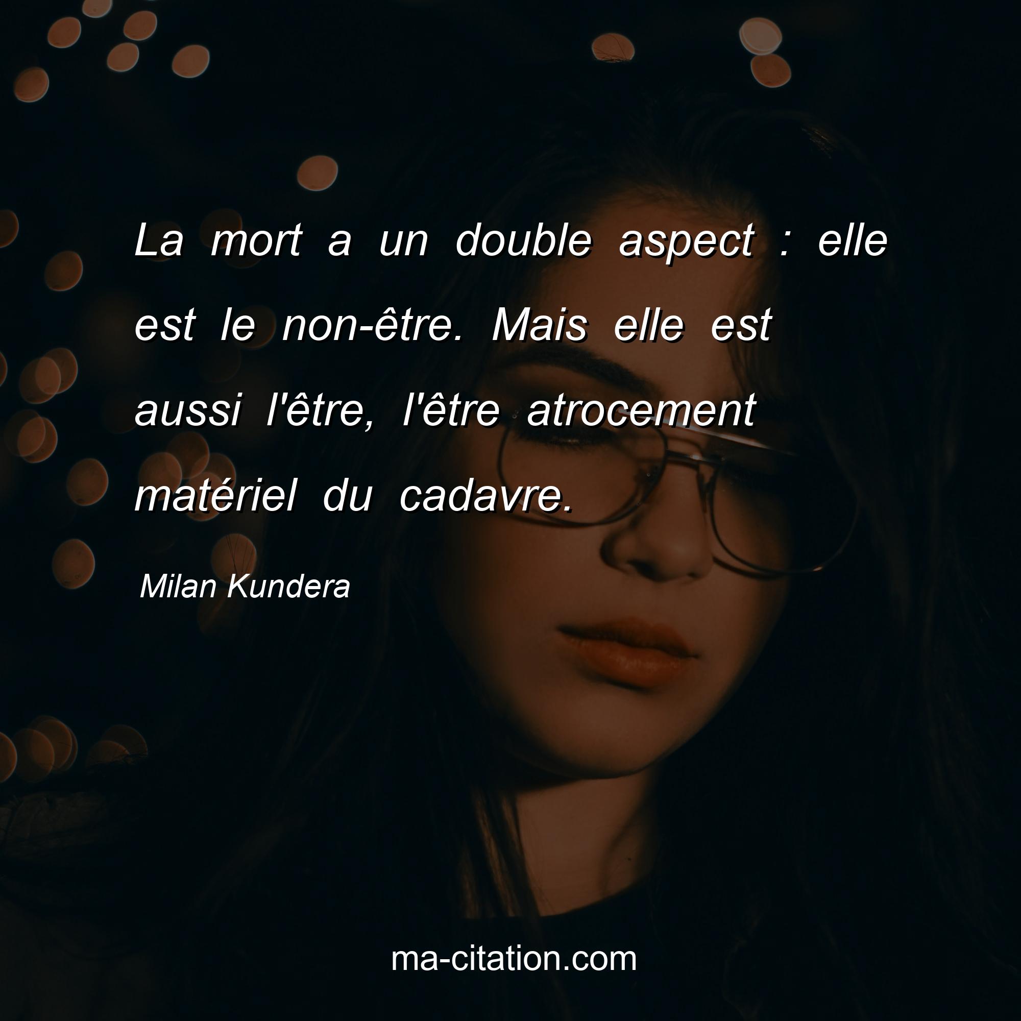 Citation sur la vie de Milan Kundera :La mort a un double aspect : elle est le non-être. Mais elle est aussi l'être, l'être atrocement matériel du cadavre.