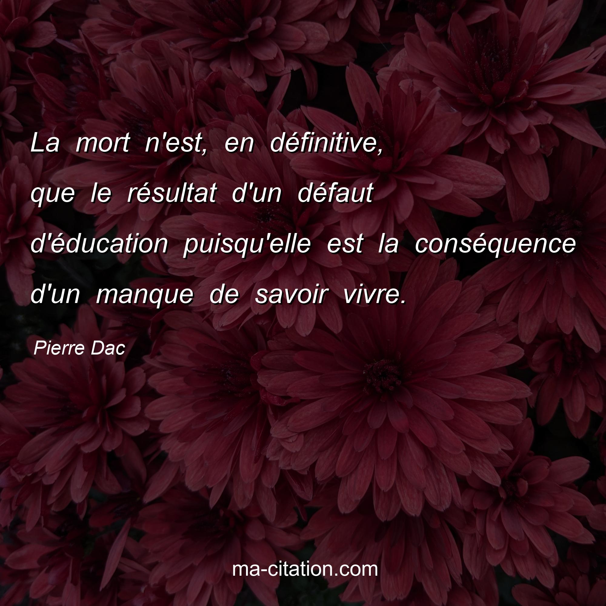 Citation sur la vie de Pierre Dac :La mort n'est, en définitive, que le résultat d'un défaut d'éducation puisqu'elle est la conséquence d'un manque de savoir vivre.