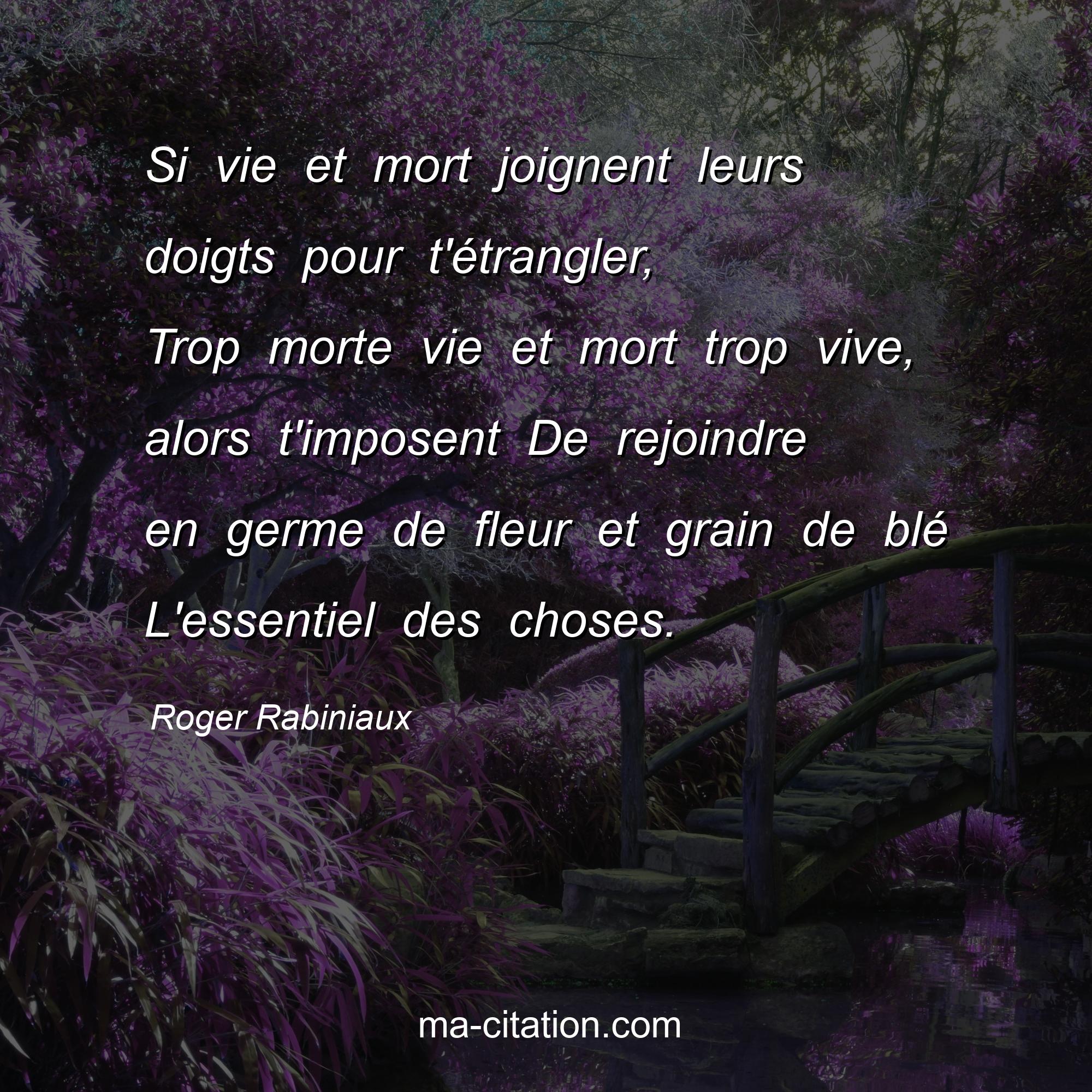 Citation sur la vie de Roger Rabiniaux :Si vie et mort joignent leurs doigts pour t'étrangler, Trop morte vie et mort trop vive, alors t'imposent De rejoindre en germe de fleur et grain de blé L'essentiel des choses.