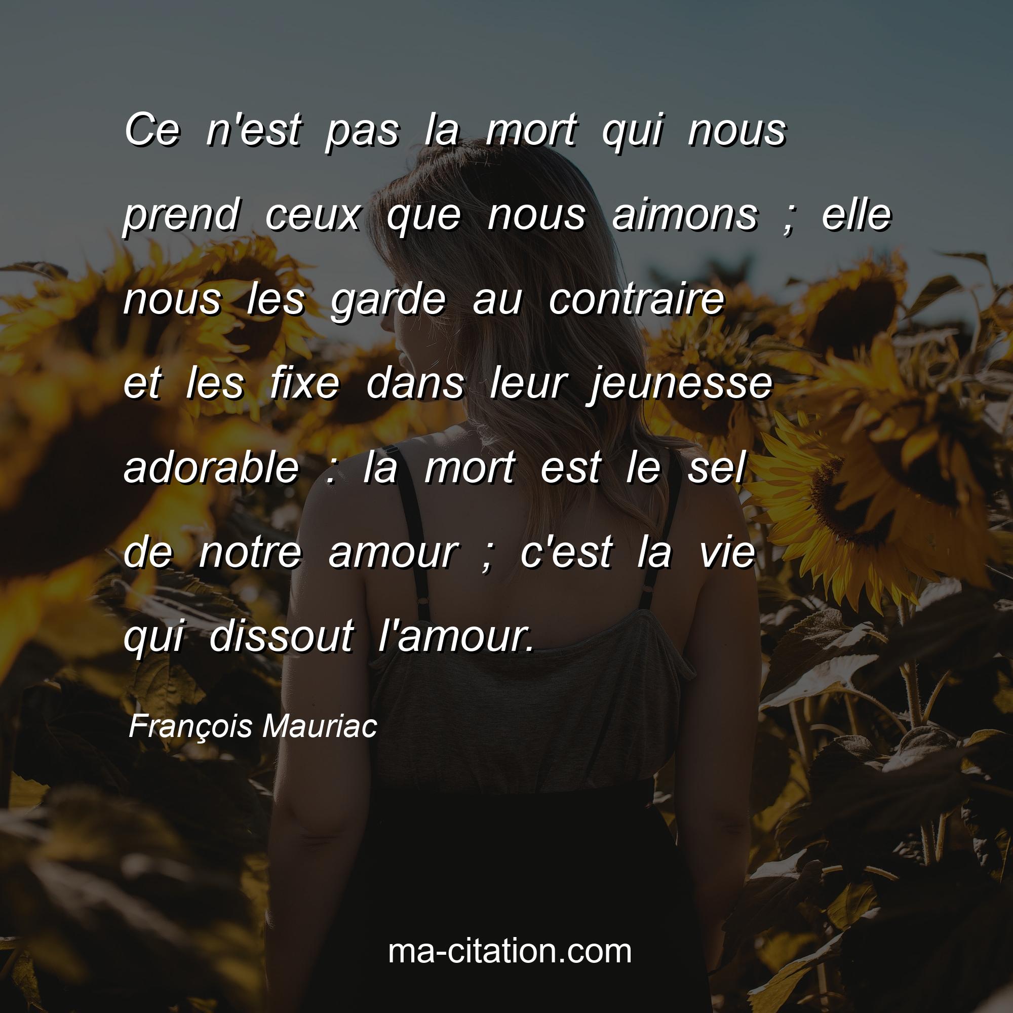 Citation sur la vie de François Mauriac :Ce n'est pas la mort qui nous prend ceux que nous aimons ; elle nous les garde au contraire et les fixe dans leur jeunesse adorable : la mort est le sel de notre amour ; c'est la vie qui dissout l'amour.