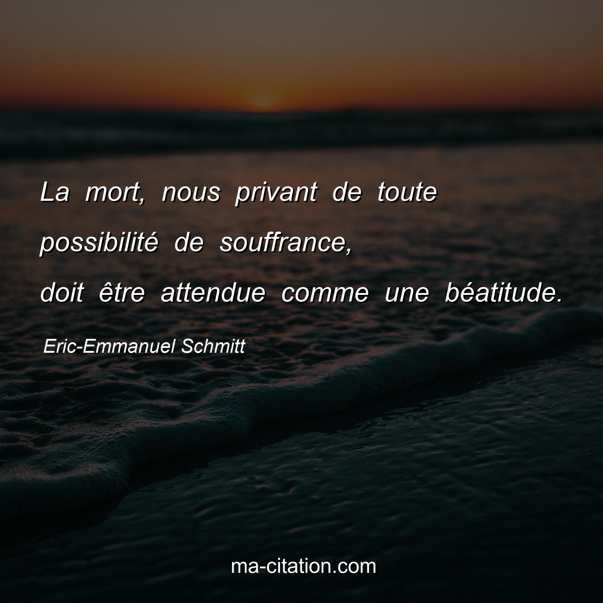Citation sur la vie d'Eric-Emmanuel Schmitt :La mort, nous privant de toute possibilité de souffrance, doit être attendue comme une béatitude.