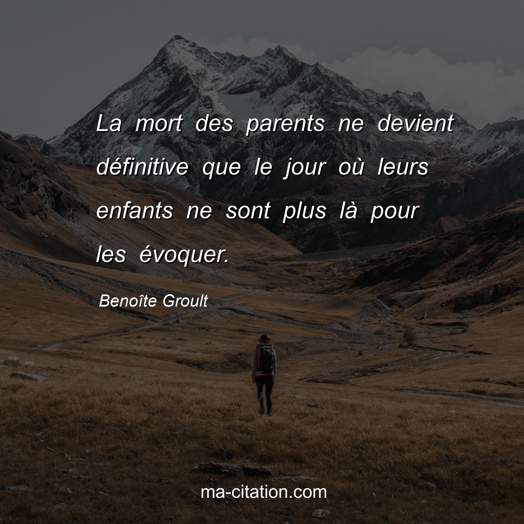 Citation sur la vie de Benoîte Groult :La mort des parents ne devient définitive que le jour où leurs enfants ne sont plus là pour les évoquer.