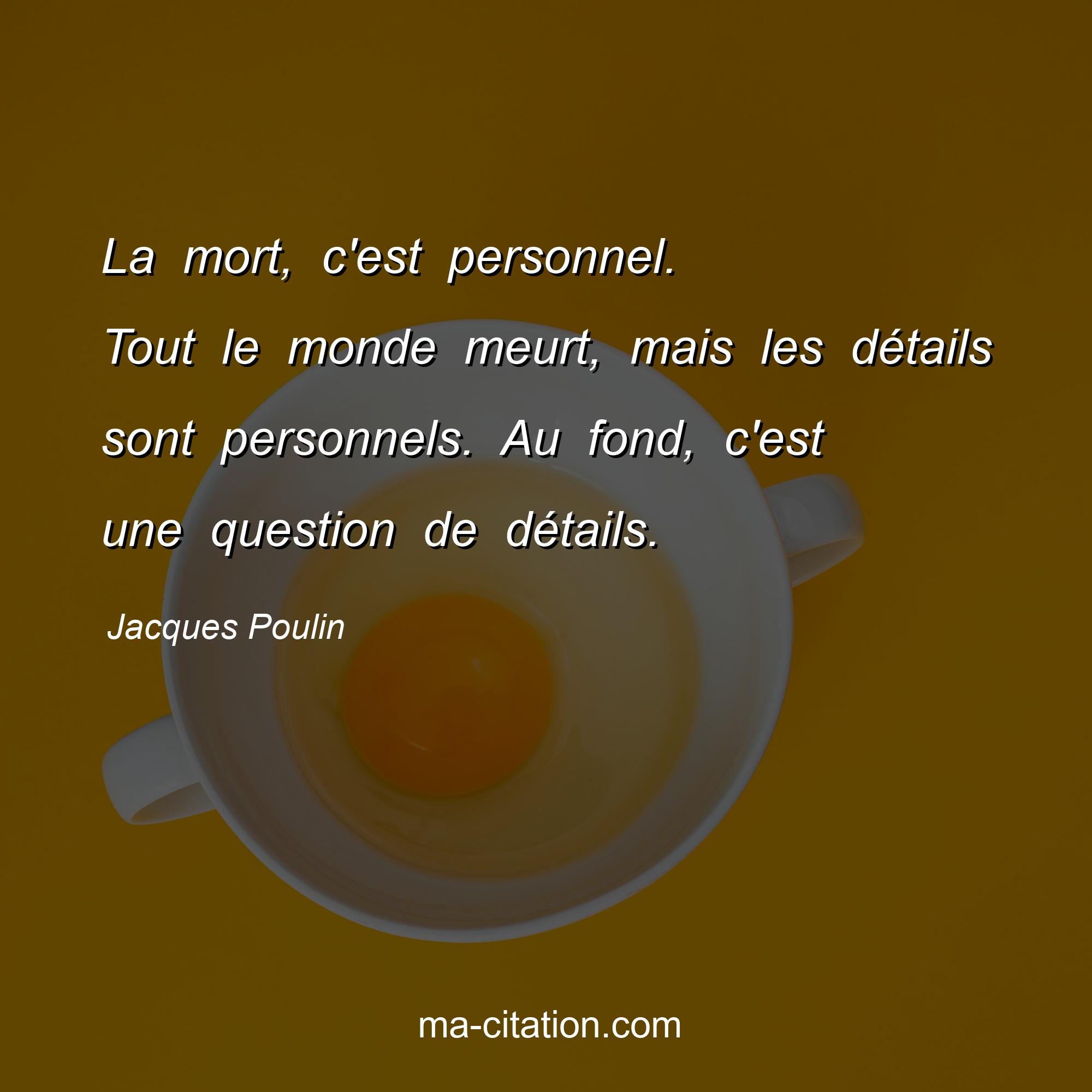 Citation sur la vie de Jacques Poulin :La mort, c'est personnel. Tout le monde meurt, mais les détails sont personnels. Au fond, c'est une question de détails.