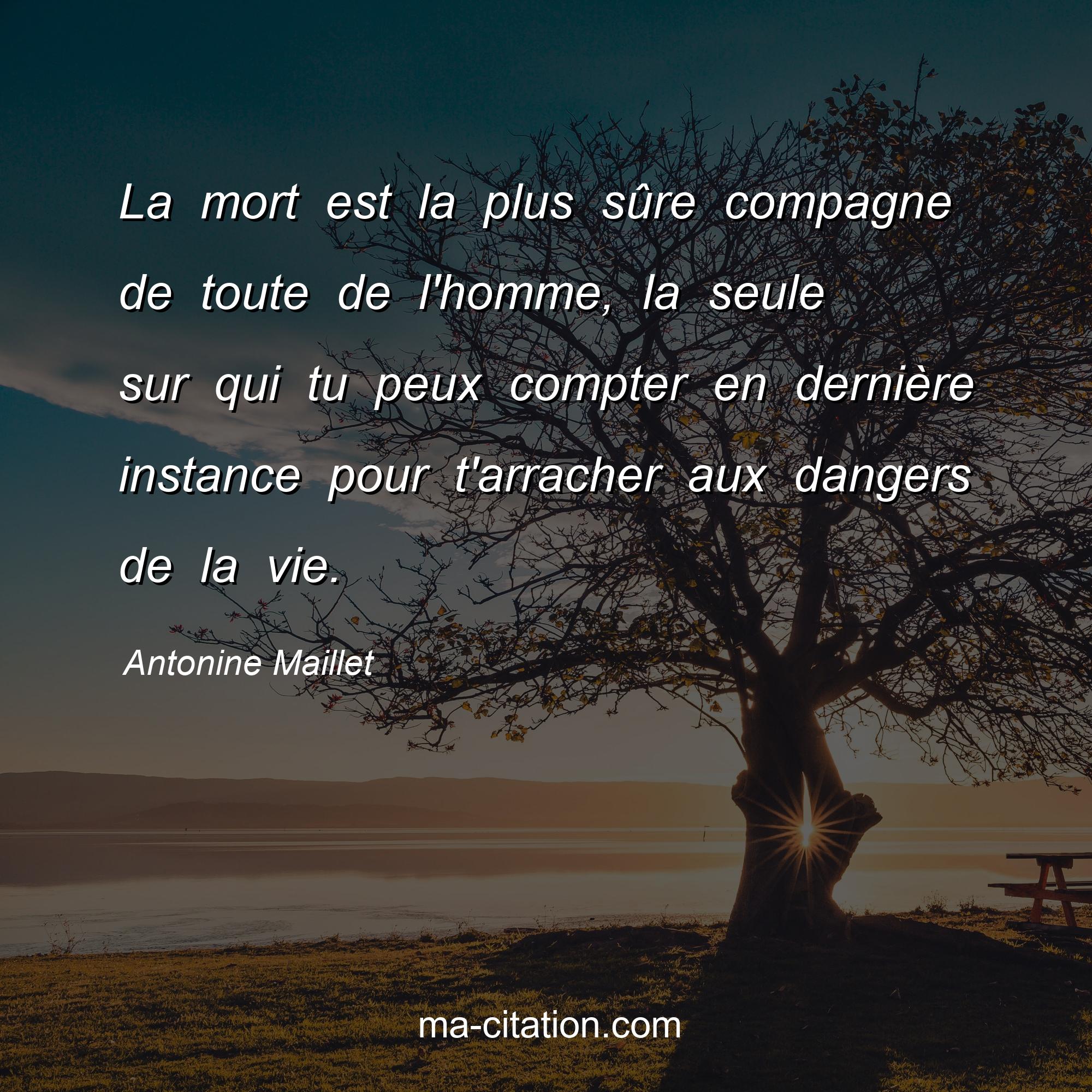 Citation sur la vie d'Antonine Maillet :La mort est la plus sûre compagne de toute de l'homme, la seule sur qui tu peux compter en dernière instance pour t'arracher aux dangers de la vie.