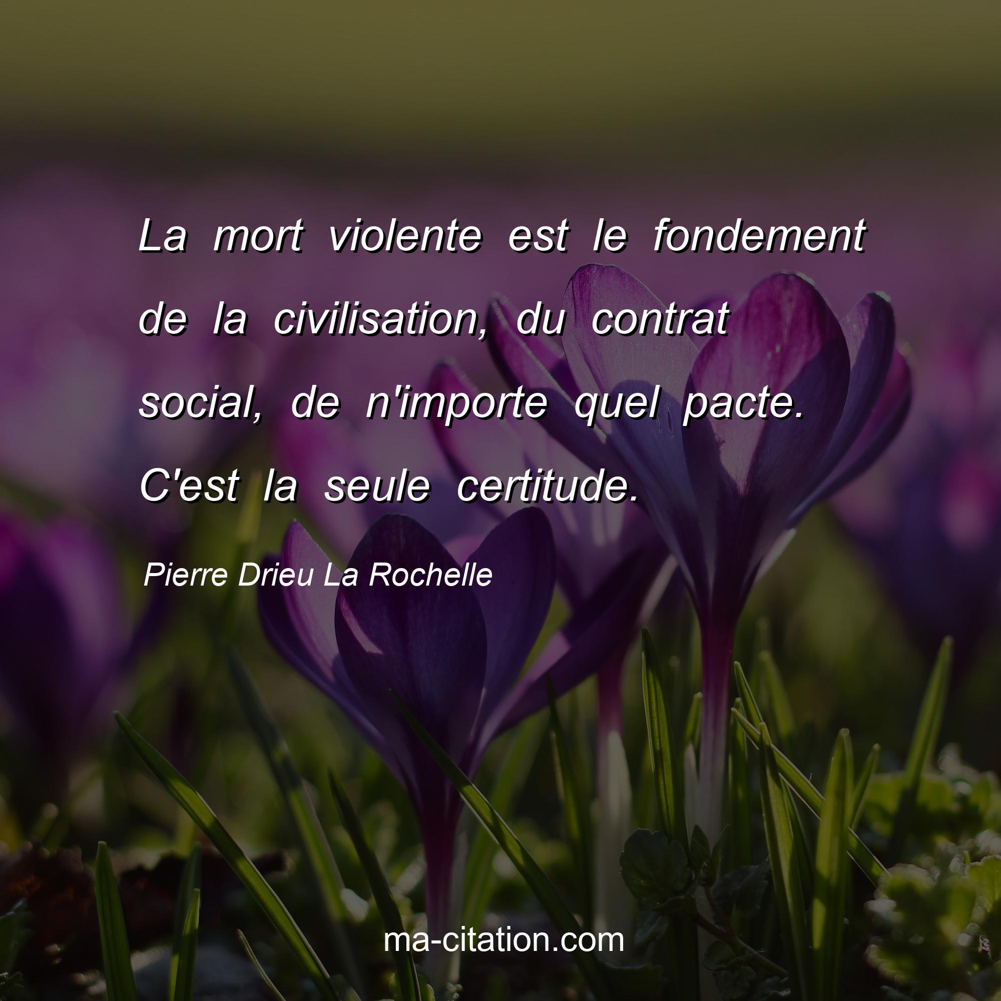 Citation sur la vie de Pierre Drieu La Rochelle :La mort violente est le fondement de la civilisation, du contrat social, de n'importe quel pacte. C'est la seule certitude.