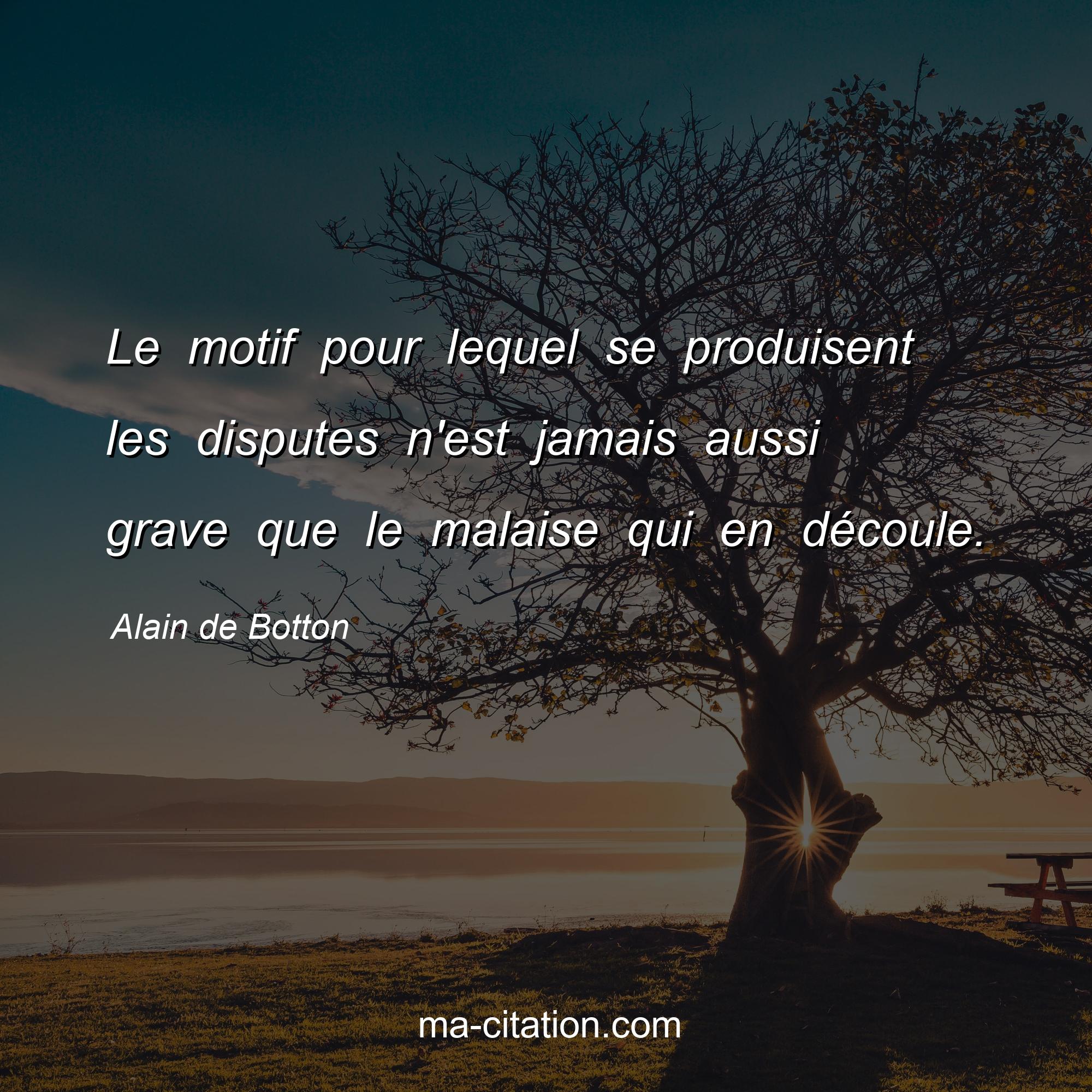 Citation sur la vie d'Alain de Botton :Le motif pour lequel se produisent les disputes n'est jamais aussi grave que le malaise qui en découle.