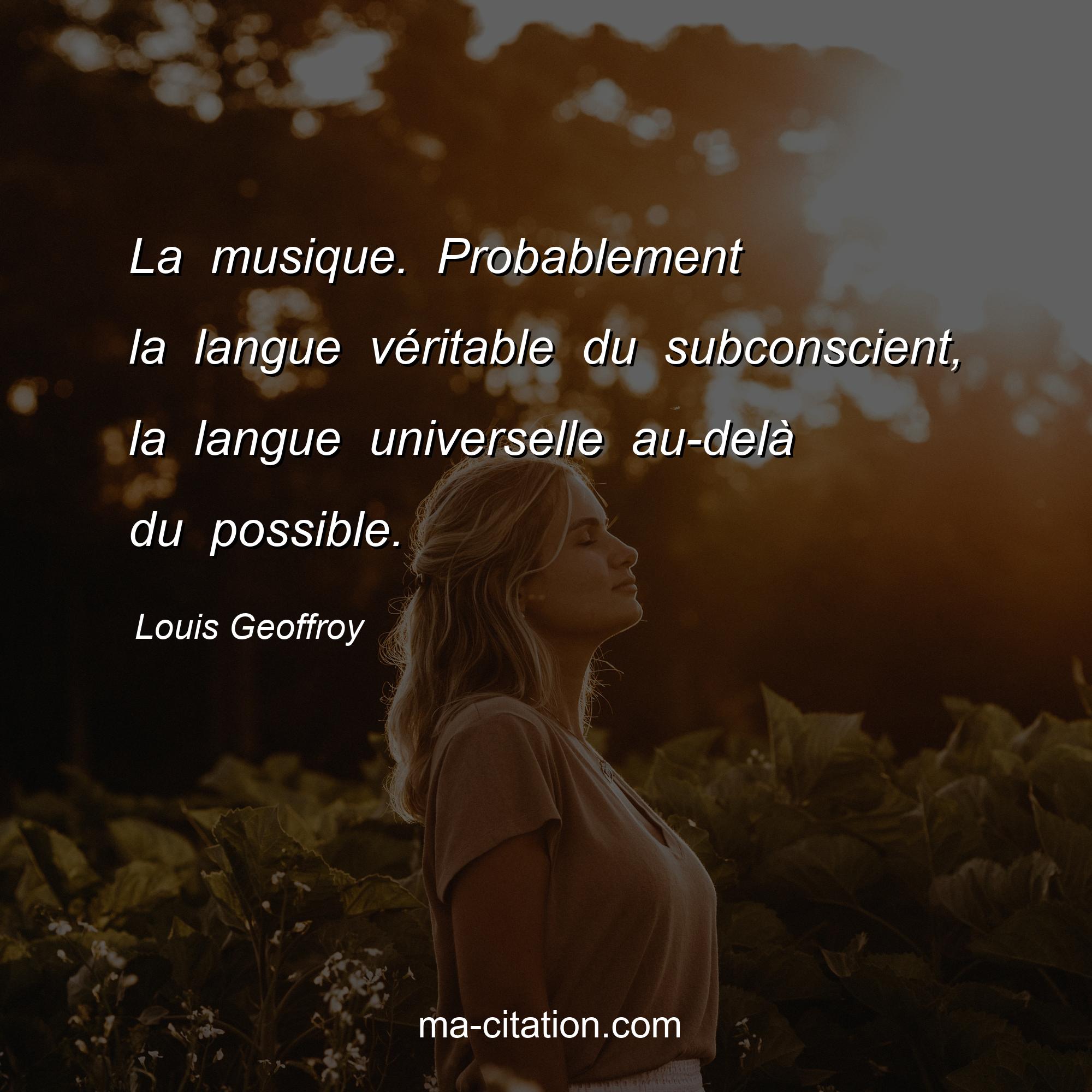 Louis Geoffroy est l'auteur de la citation sur la vie "La musique. Probablement la langue véritable du subconscient, la langue universelle au-delà du possible.".