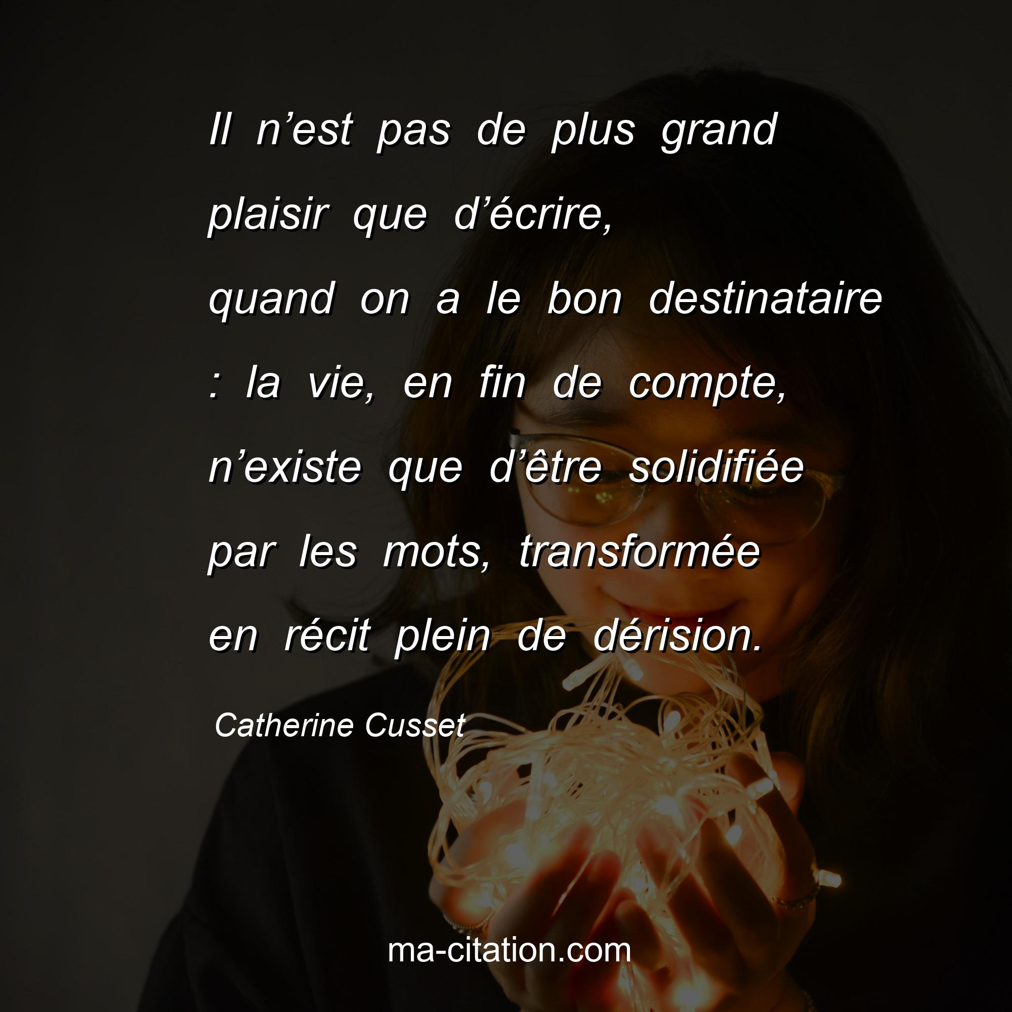 Citation sur la vie de Catherine Cusset :Il n’est pas de plus grand plaisir que d’écrire, quand on a le bon destinataire : la vie, en fin de compte, n’existe que d’être solidifiée par les mots, transformée en récit plein de dérision.