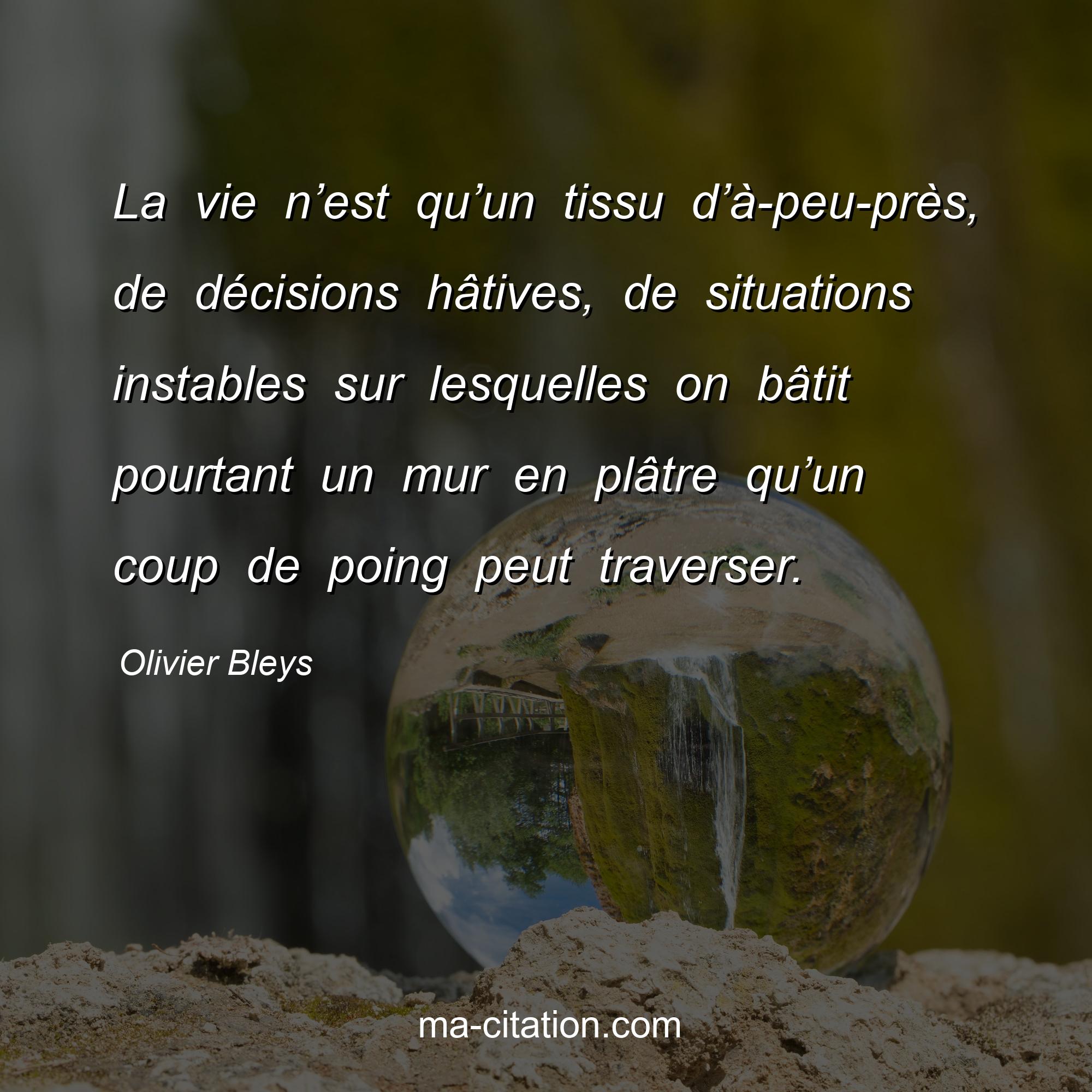 Citation sur la vie d'Olivier Bleys :La vie n’est qu’un tissu d’à -peu-près, de décisions hâtives, de situations instables sur lesquelles on bâtit pourtant un mur en plâtre qu’un coup de poing peut traverser.