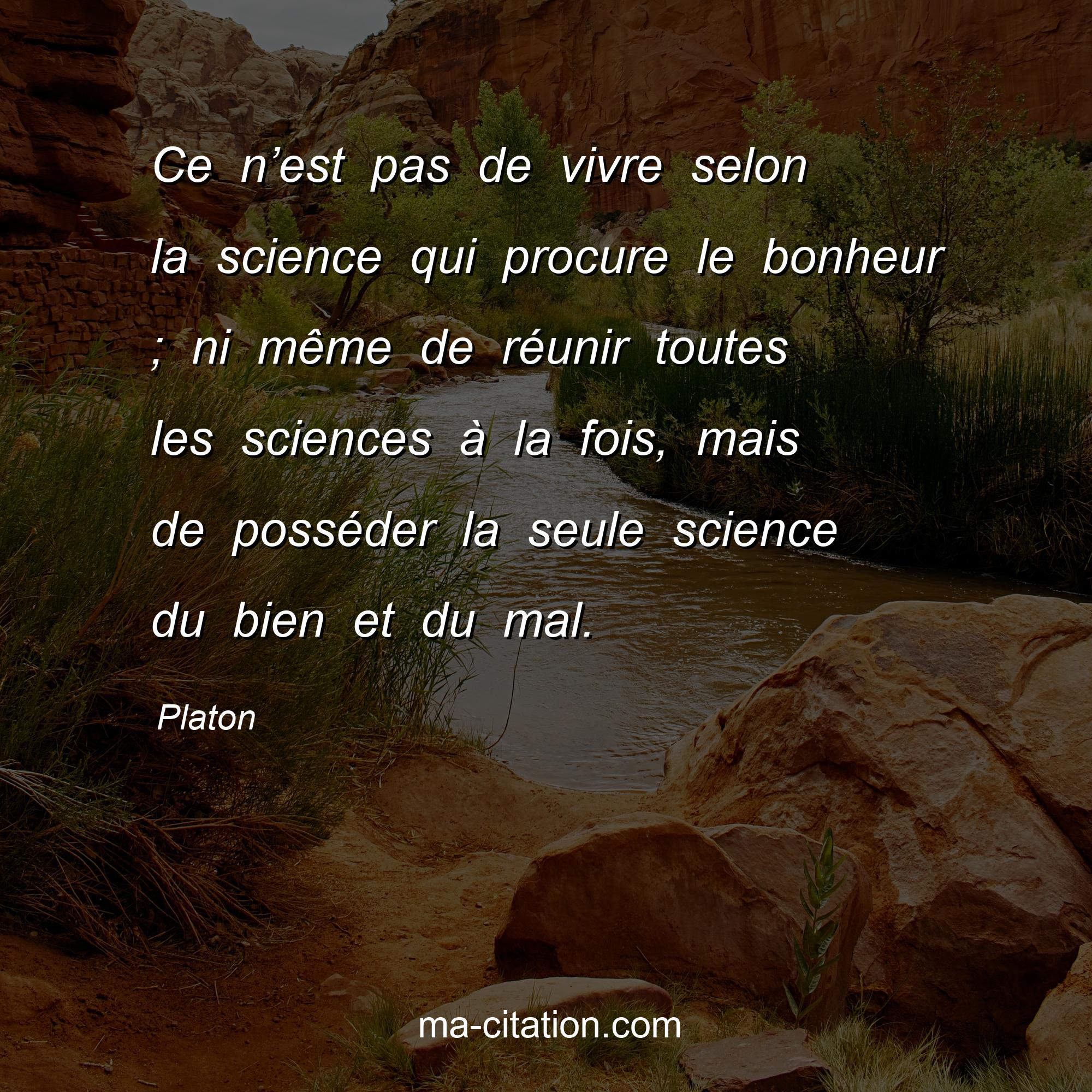 Citation sur la vie de Platon :Ce n’est pas de vivre selon la science qui procure le bonheur ; ni même de réunir toutes les sciences à la fois, mais de posséder la seule science du bien et du mal.