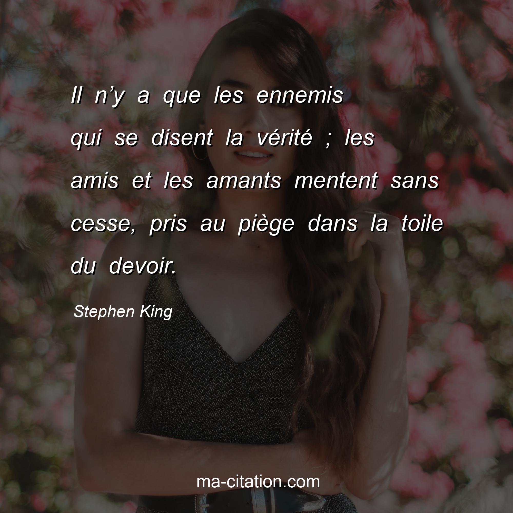 Citation sur la vie de Stephen King :Il n’y a que les ennemis qui se disent la vérité ; les amis et les amants mentent sans cesse, pris au piège dans la toile du devoir.