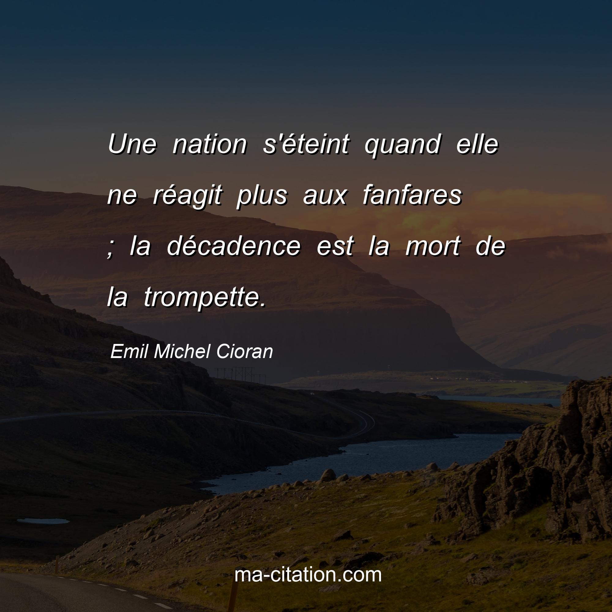 Emil Michel Cioran est l'auteur de la citation sur la vie "Une nation s'éteint quand elle ne réagit plus aux fanfares ; la décadence est la mort de la trompette.".