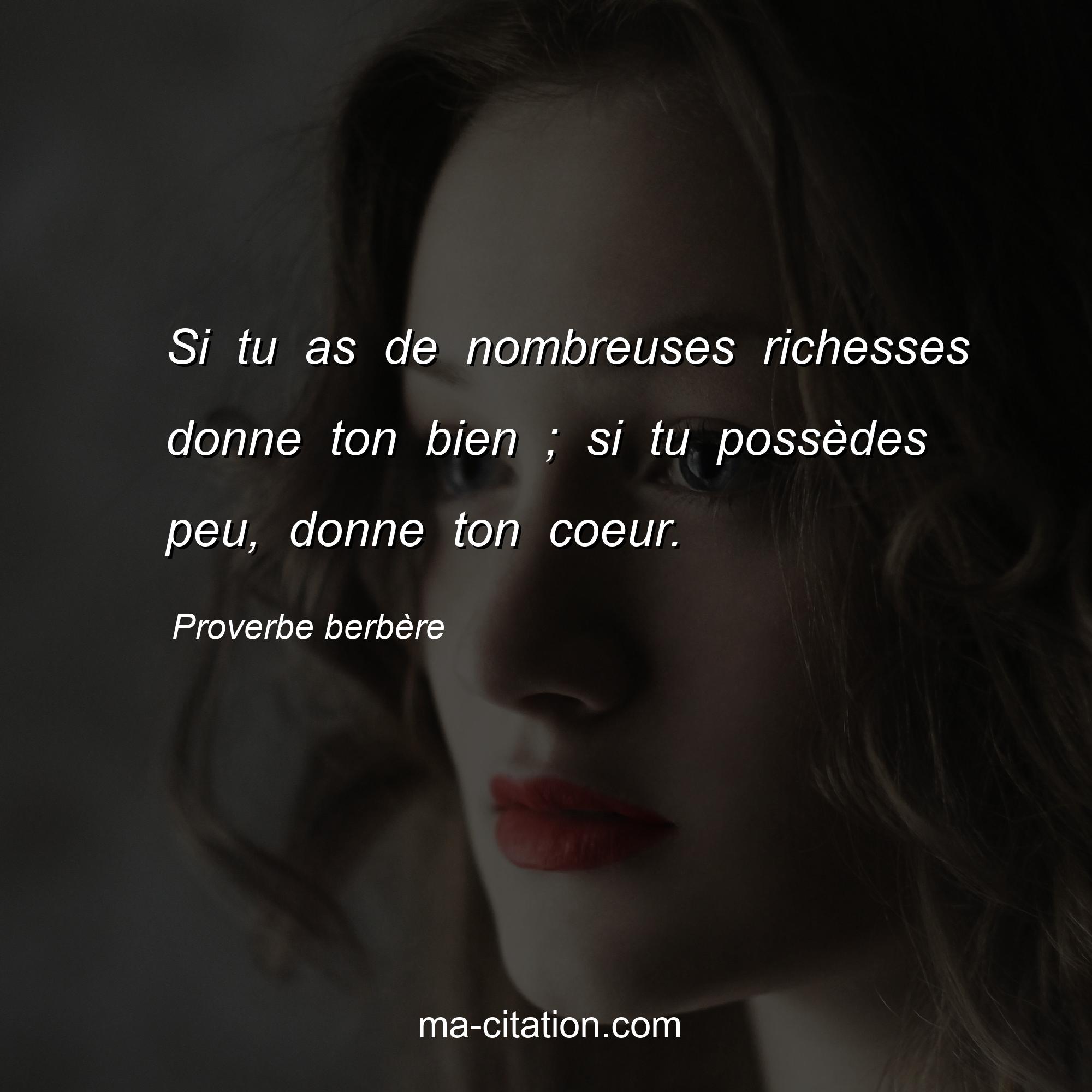 Proverbe berbère sur la vie :Si tu as de nombreuses richesses donne ton bien ; si tu possèdes peu, donne ton coeur.