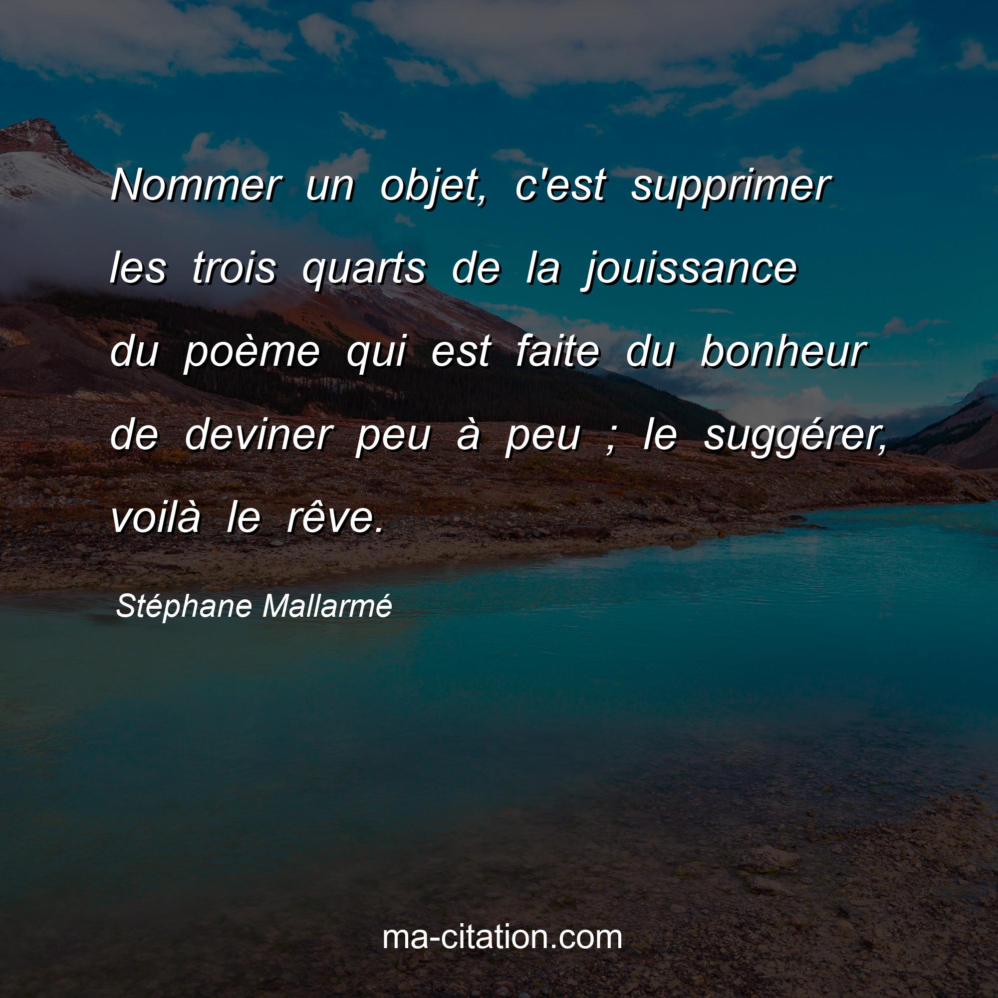 Citation sur la vie de Stéphane Mallarmé :Nommer un objet, c'est supprimer les trois quarts de la jouissance du poème qui est faite du bonheur de deviner peu à peu ; le suggérer, voilà le rêve.