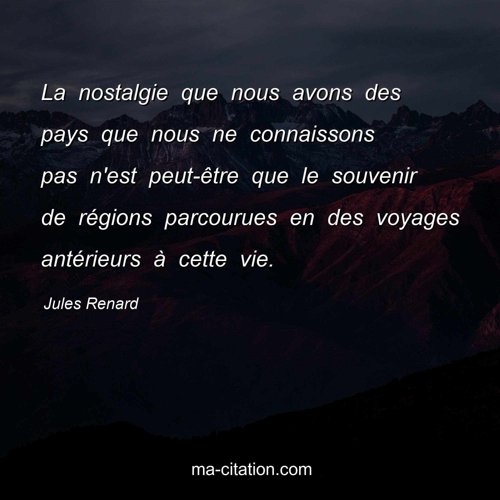 Citation sur la vie de Jules Renard :La nostalgie que nous avons des pays que nous ne connaissons pas n'est peut-être que le souvenir de régions parcourues en des voyages antérieurs à cette vie.
