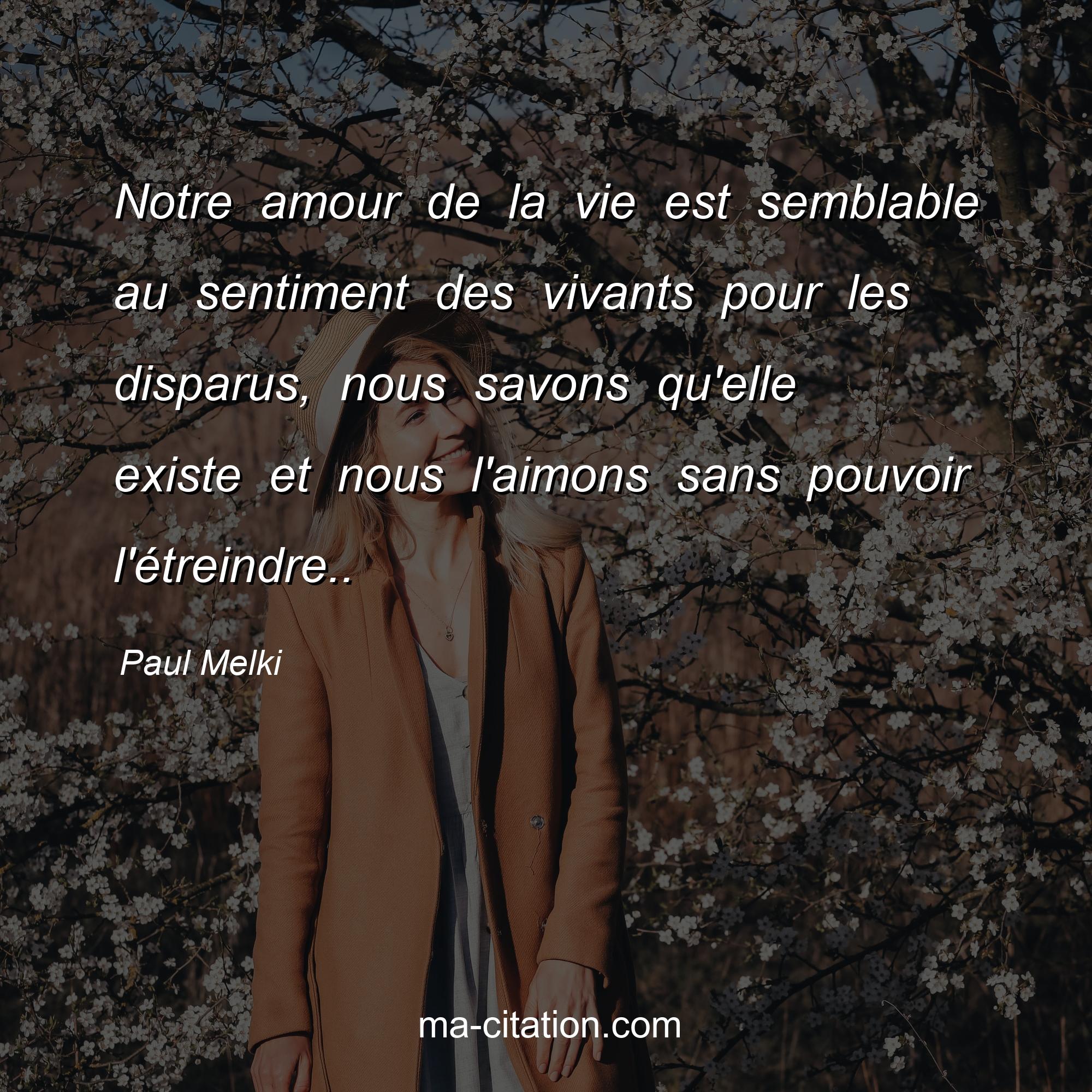 Citation sur la vie de Paul Melki :Notre amour de la vie est semblable au sentiment des vivants pour les disparus, nous savons qu'elle existe et nous l'aimons sans pouvoir l'étreindre..