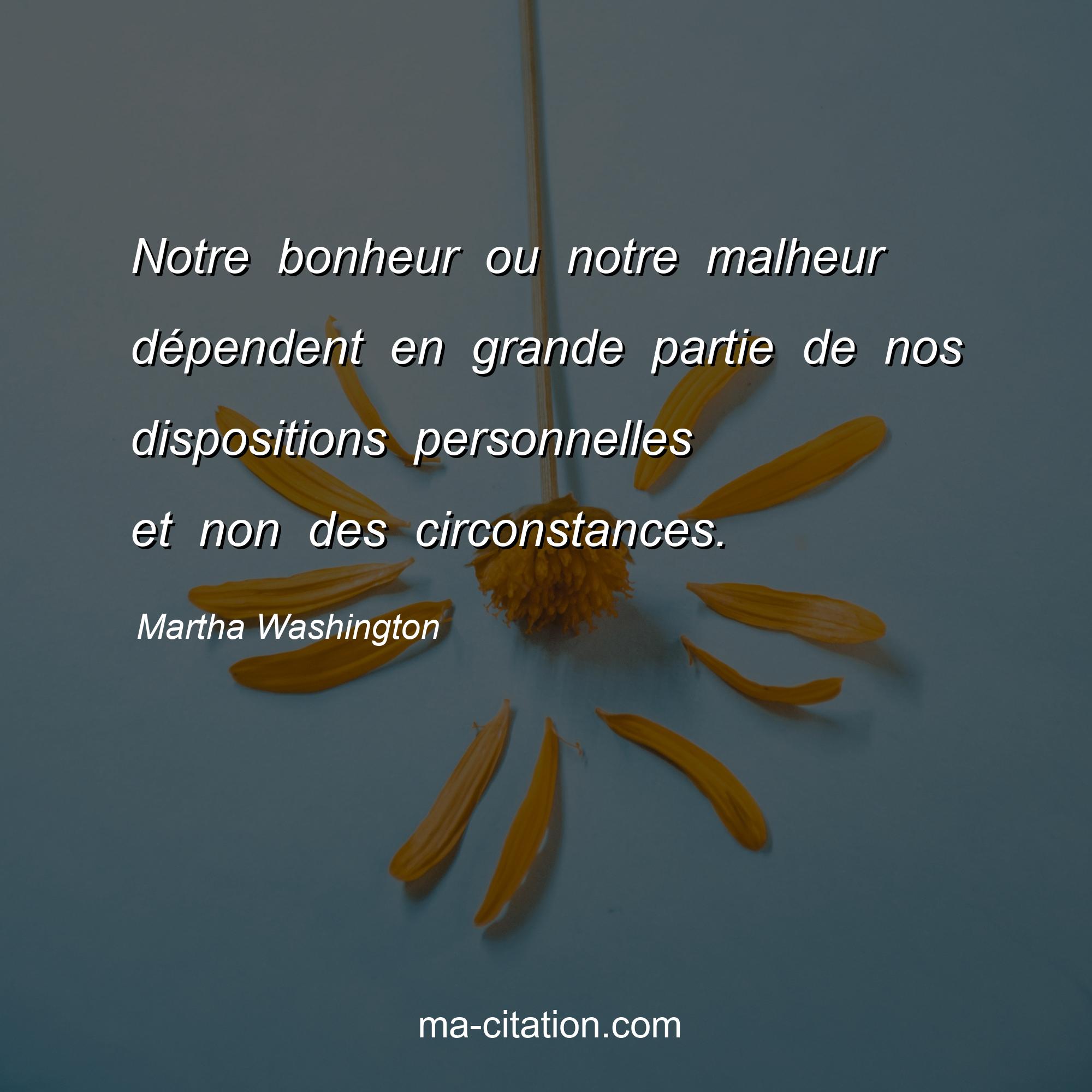 Citation sur la vie de Martha Washington :Notre bonheur ou notre malheur dépendent en grande partie de nos dispositions personnelles et non des circonstances.