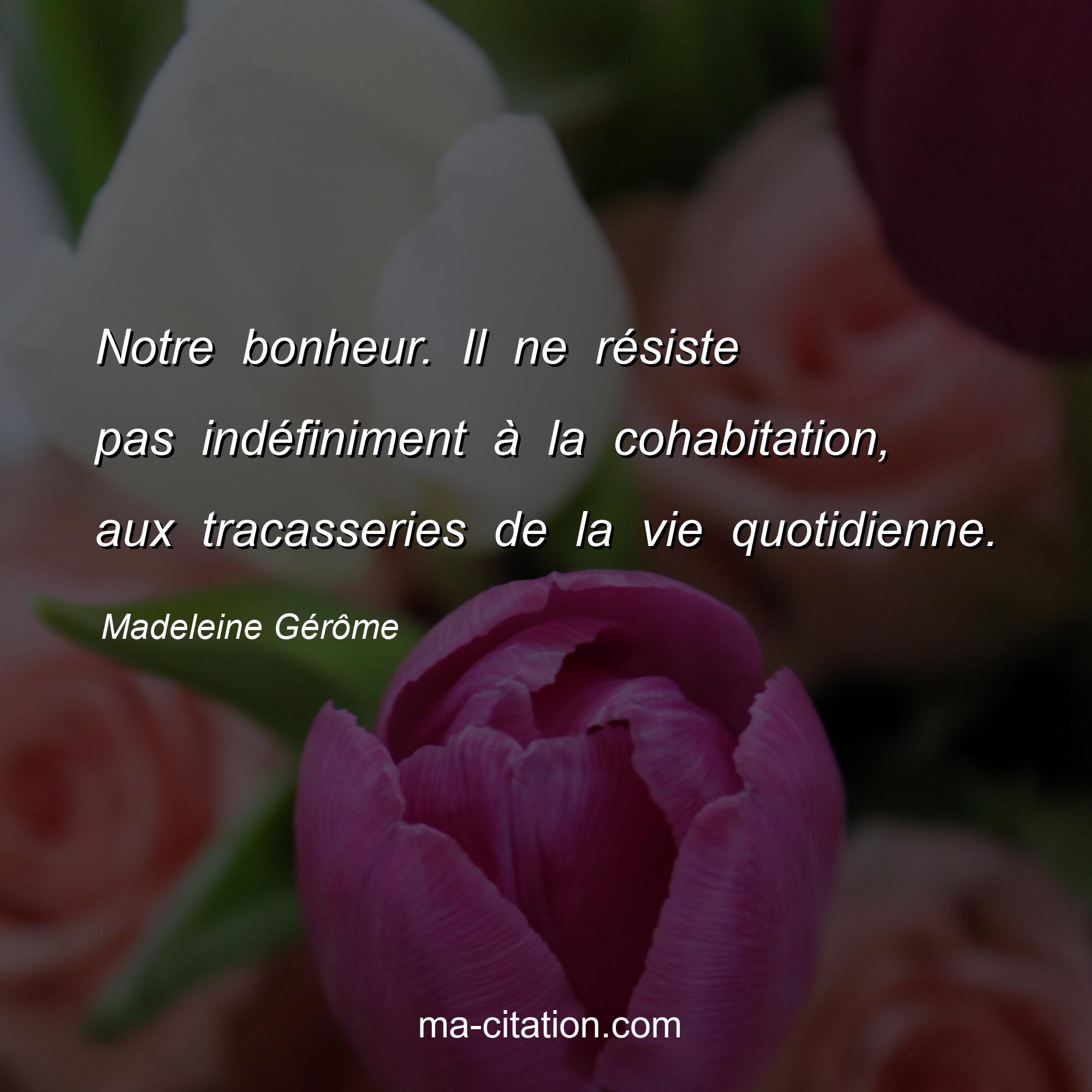 Citation sur la vie de Madeleine Gérôme :Notre bonheur. Il ne résiste pas indéfiniment à la cohabitation, aux tracasseries de la vie quotidienne.