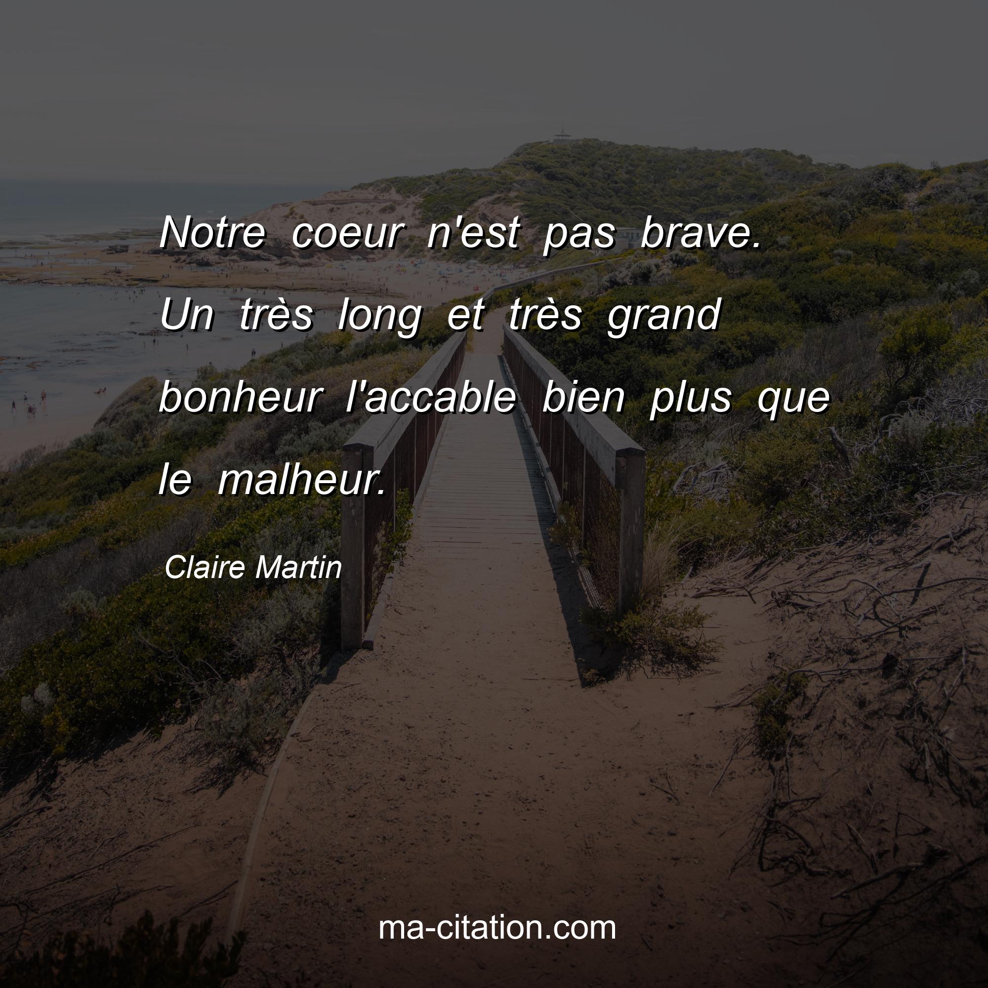 Claire Martin est l'auteur de la citation sur la vie "Notre coeur n'est pas brave. Un très long et très grand bonheur l'accable bien plus que le malheur.".