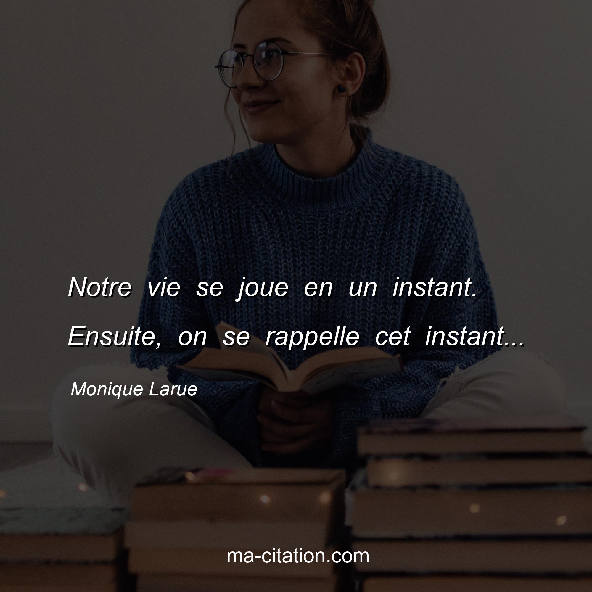 Monique Larue est l'auteur de la citation sur la vie "Notre vie se joue en un instant. Ensuite, on se rappelle cet instant...".