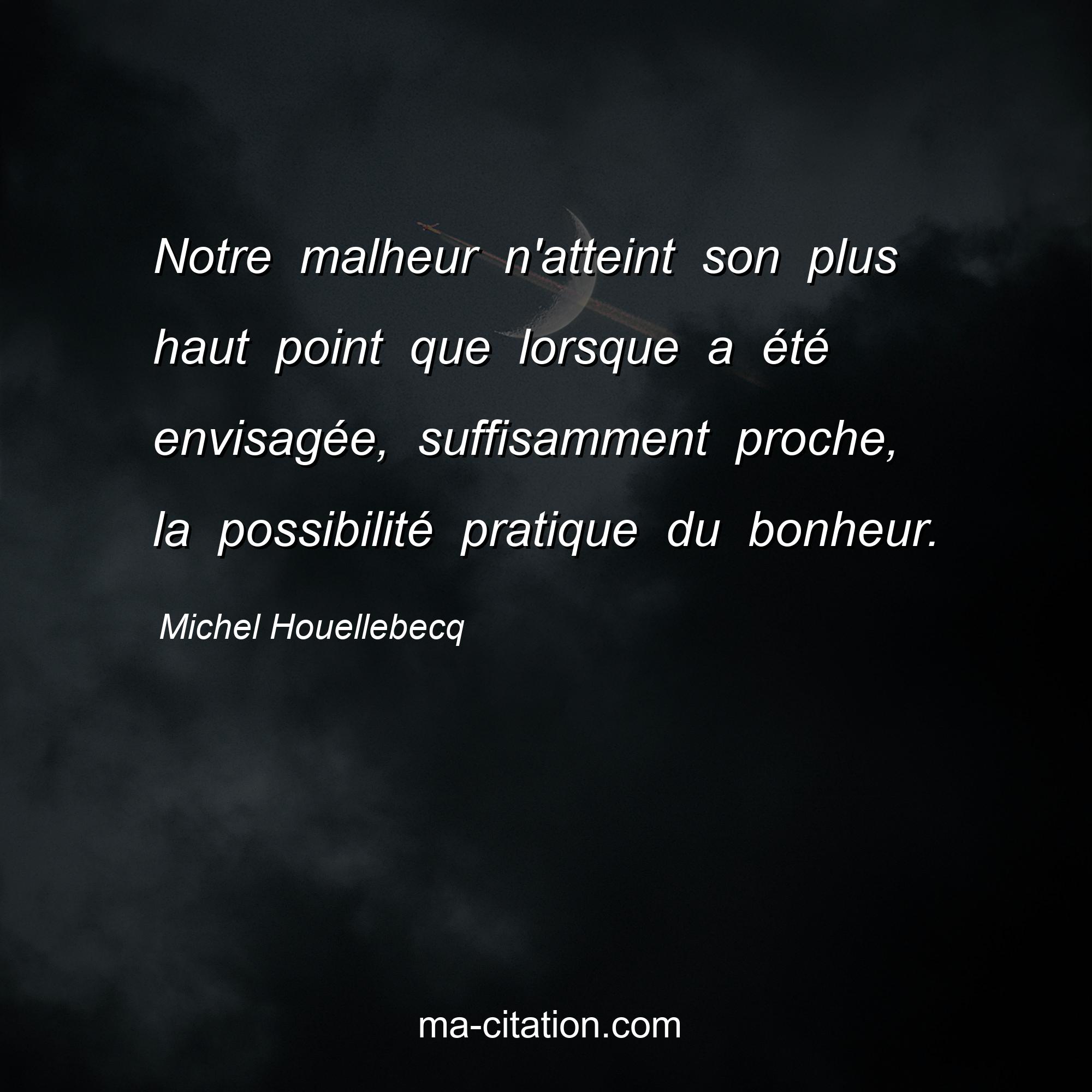 Citation sur la vie de Michel Houellebecq :Notre malheur n'atteint son plus haut point que lorsque a été envisagée, suffisamment proche, la possibilité pratique du bonheur.