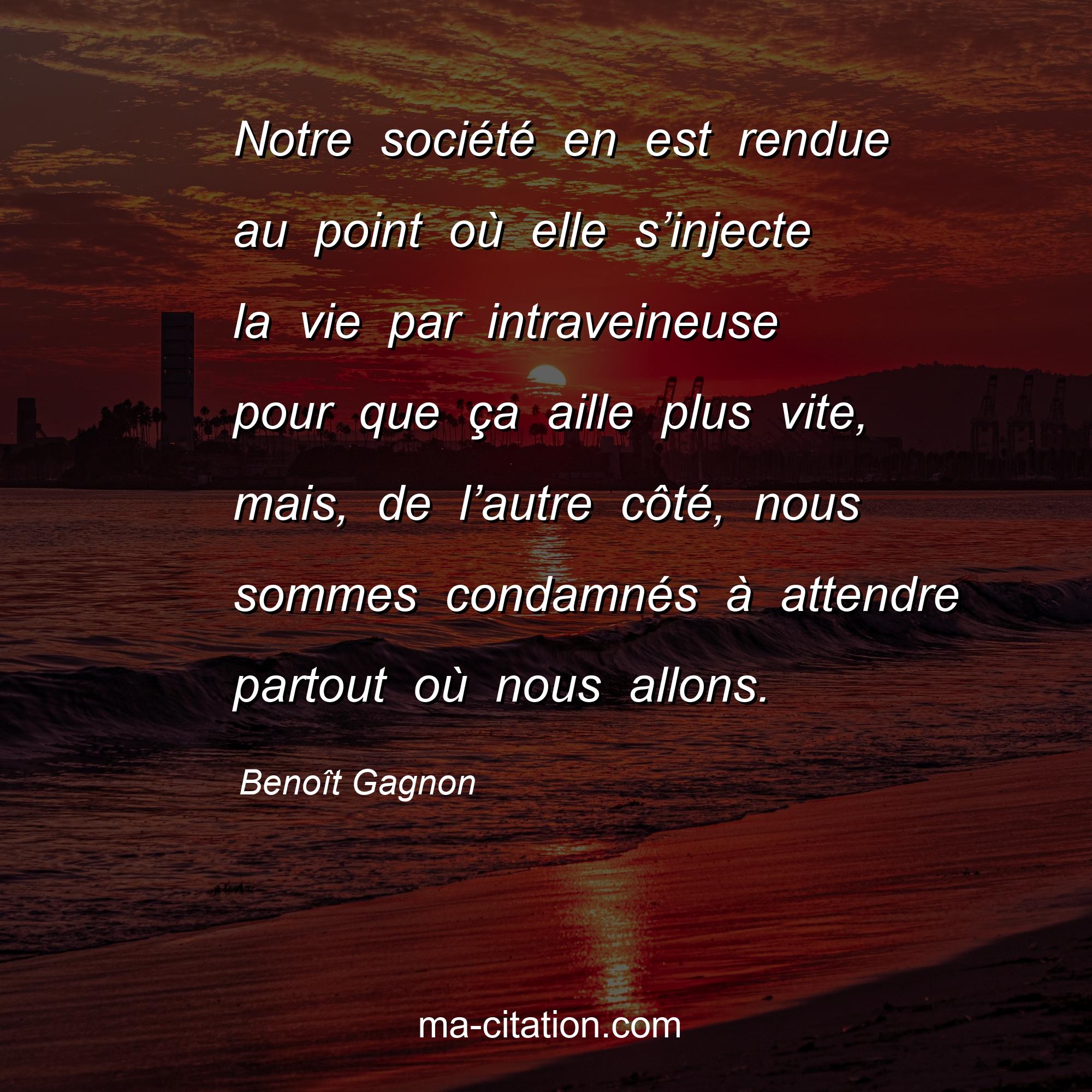 Citation sur la vie de Benoît Gagnon :Notre société en est rendue au point où elle s’injecte la vie par intraveineuse pour que ça aille plus vite, mais, de l’autre côté, nous sommes condamnés à attendre partout où nous allons.