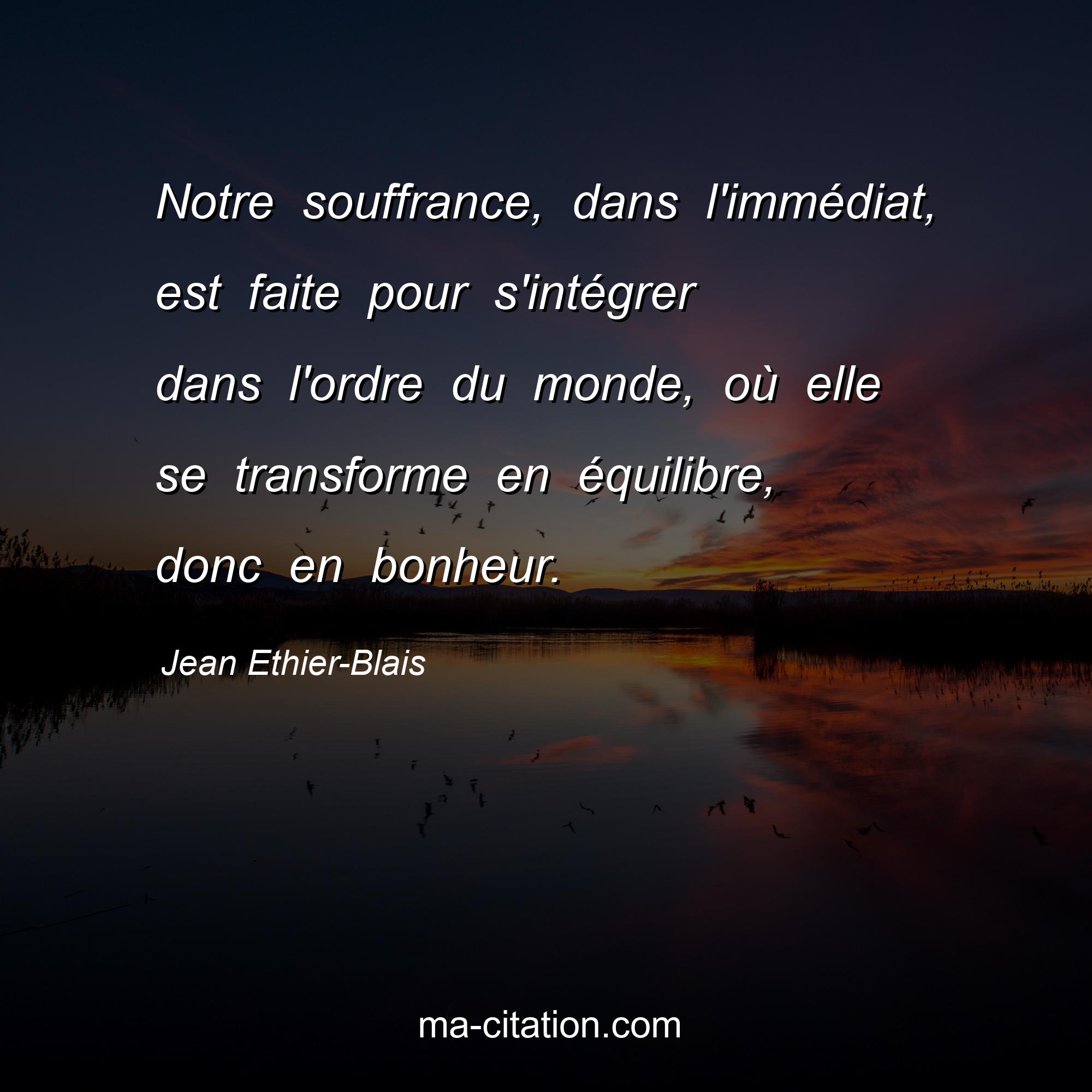 Jean Ethier-Blais est l'auteur de la citation sur la vie "Notre souffrance, dans l'immédiat, est faite pour s'intégrer dans l'ordre du monde, où elle se transforme en équilibre, donc en bonheur.".
