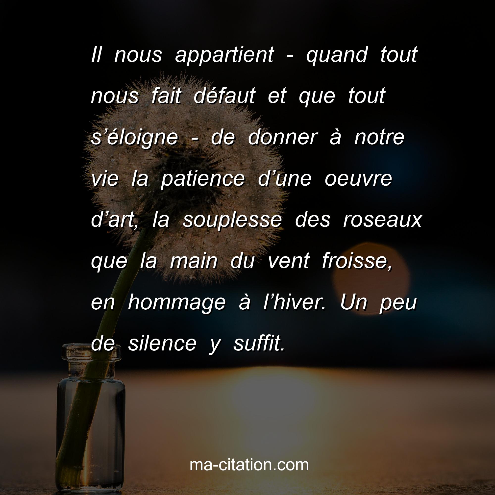 Il nous appartient - quand tout nous fait défaut et que tout s’éloigne - de donner à notre vie la patience d’une oeuvre d’art, la souplesse des roseaux que la main du vent froisse, en hommage à l’hiver. Un peu de silence y suffit.