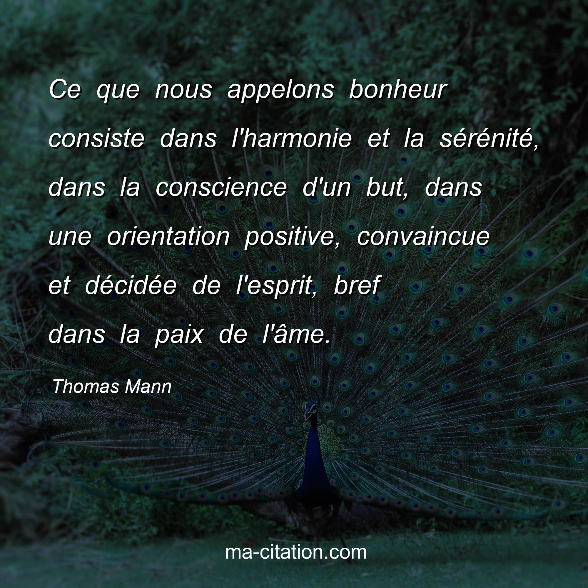 Citation sur la vie de Thomas Mann :Ce que nous appelons bonheur consiste dans l'harmonie et la sérénité, dans la conscience d'un but, dans une orientation positive, convaincue et décidée de l'esprit, bref dans la paix de l'âme.